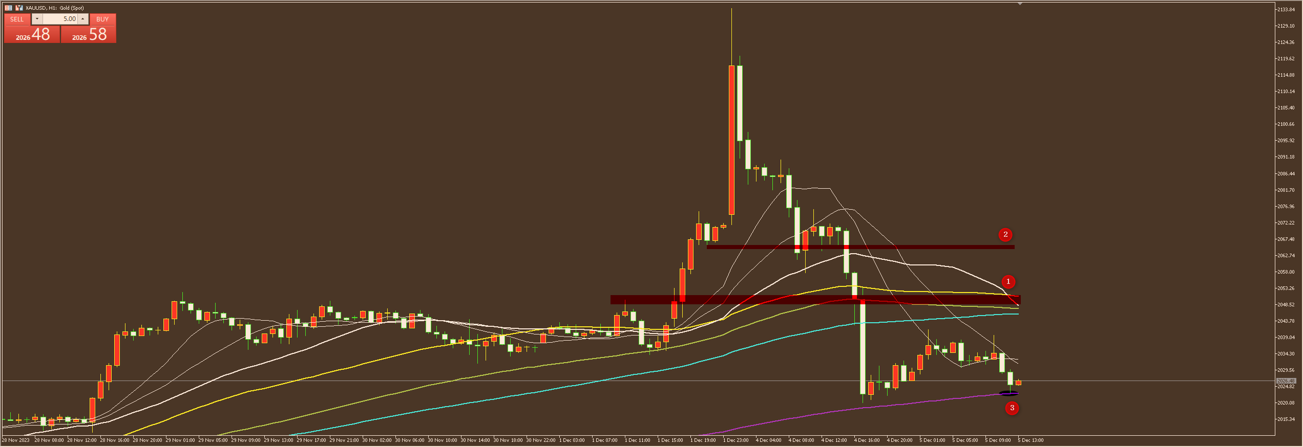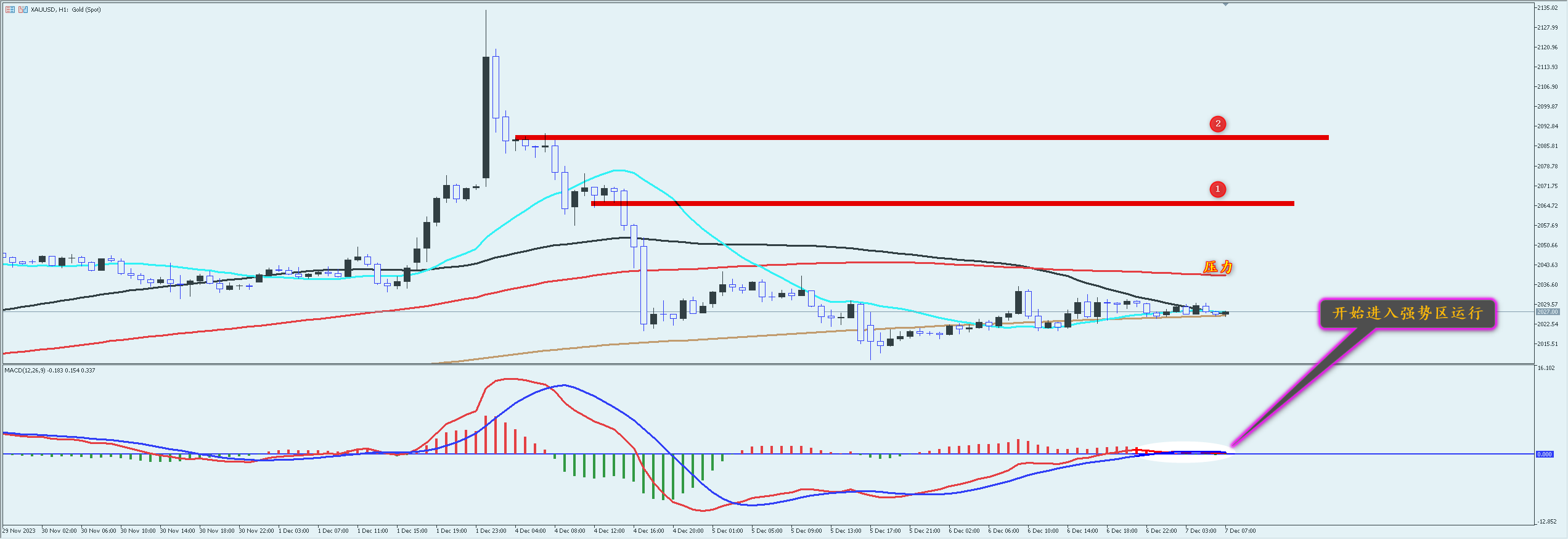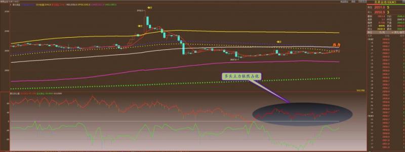 通过对黄金小时图解析得知,黄金从早盘继续冲高回落在上方2041附近受阻回落正如小妹中午所说行情目前不具备反转短期应该是还要震荡调整的,刚才在下方3号均线支撑位有所反弹,短期相对而言将会继续震荡调整运行,不排除继续向上反弹短期我们上方重点关注12号压力位,短期在操作上我们继续高空低多思路,具体建议参考早盘