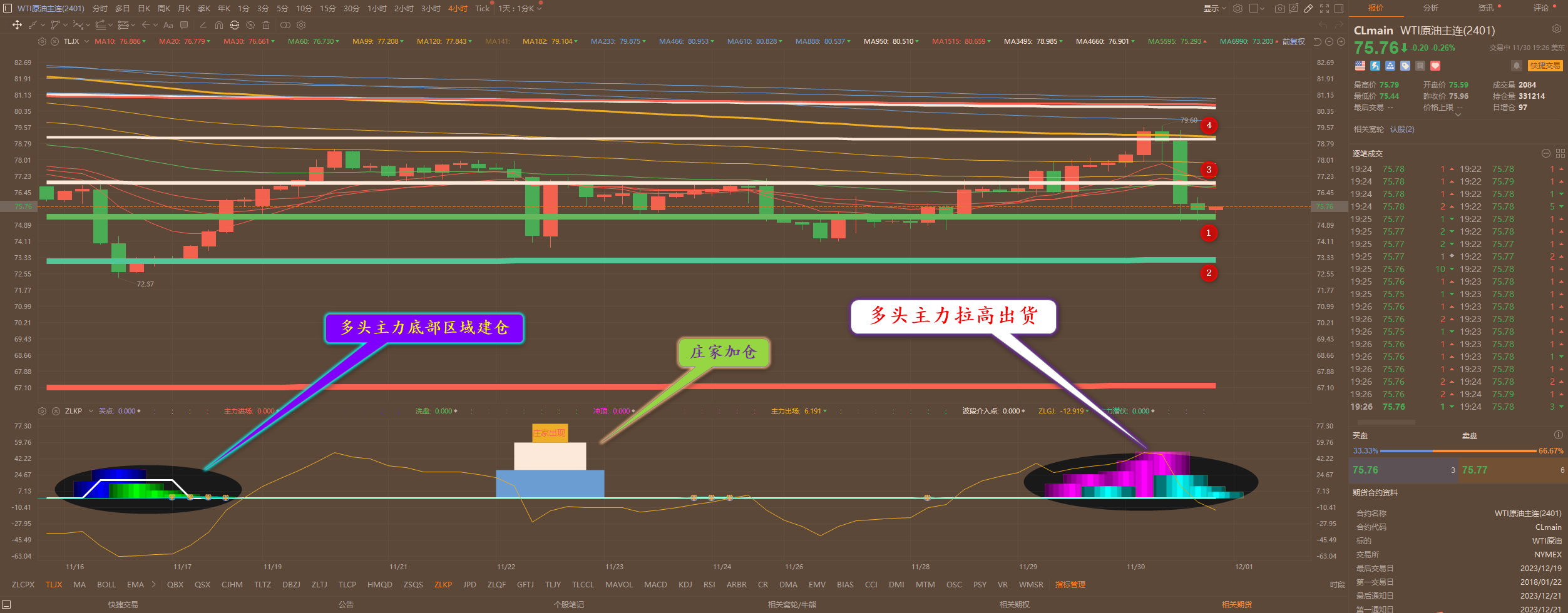 通过对原油4小时图解析得知,昨日行情先涨后跌,我们从下方的幅图可以清楚地看到,在前期底部区域出现多头主力进仓和加仓信号盘中出现了大幅反弹上涨动作,到达昨日上方79.60一线的压力位冲高回落,下方幅图显示在高位出现了多头主力出货的动作,目前在下方1号均线支撑位止跌反弹,盘中不排除进一步下探到达下方2号均线