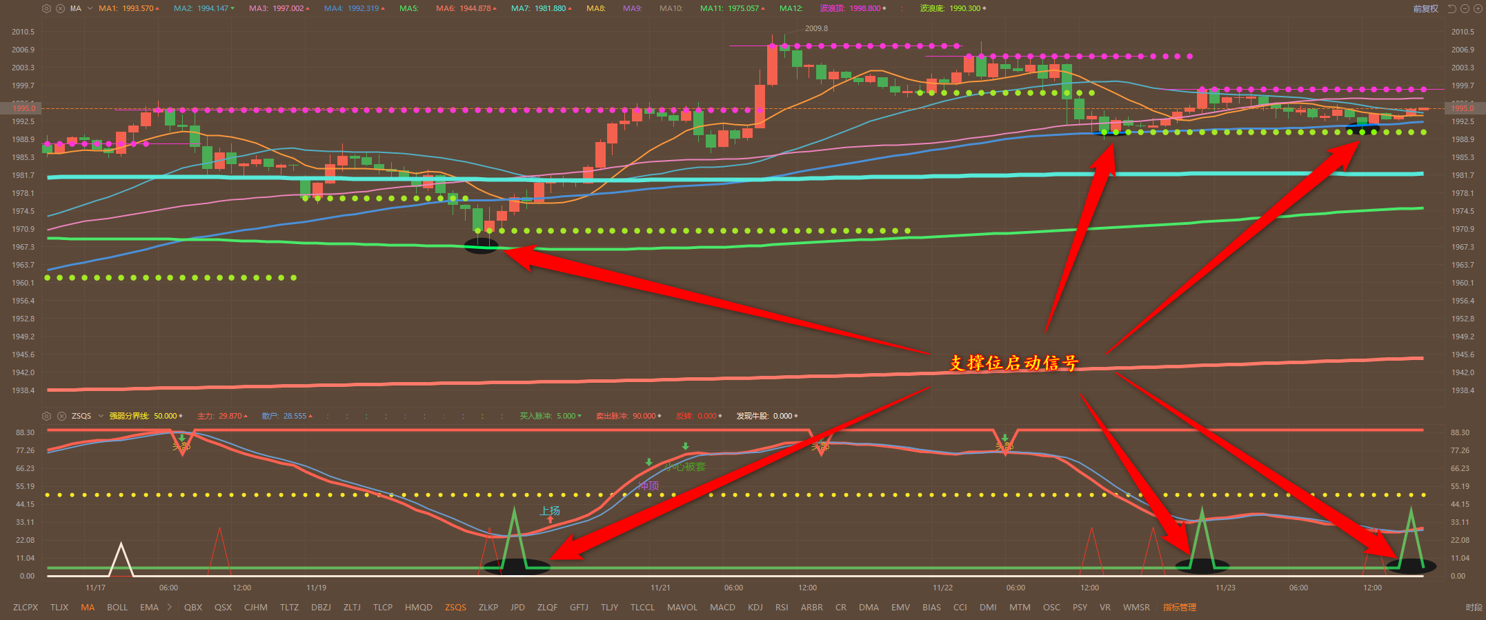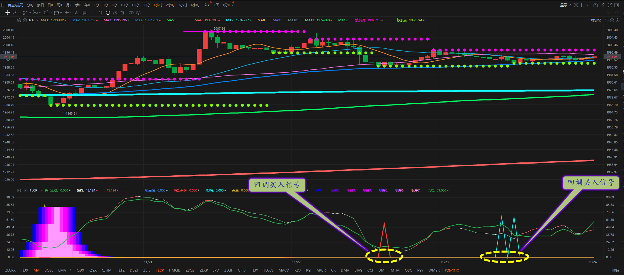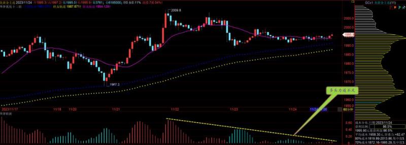 通过对黄金小时图解析得知,黄金从到目前为止一直实在窄幅震荡调整运行,受感恩节影响波动比较小,从图中我们可以清楚的看到在下方均线支撑位都得到有效的支撑,并且我们从下方的附图可以清楚的看到在下方支撑位都出现了回调买入信号,非常有可能行情将会进一步的实现突破,短期上方我们继续先关注1998一线的压制,下方1