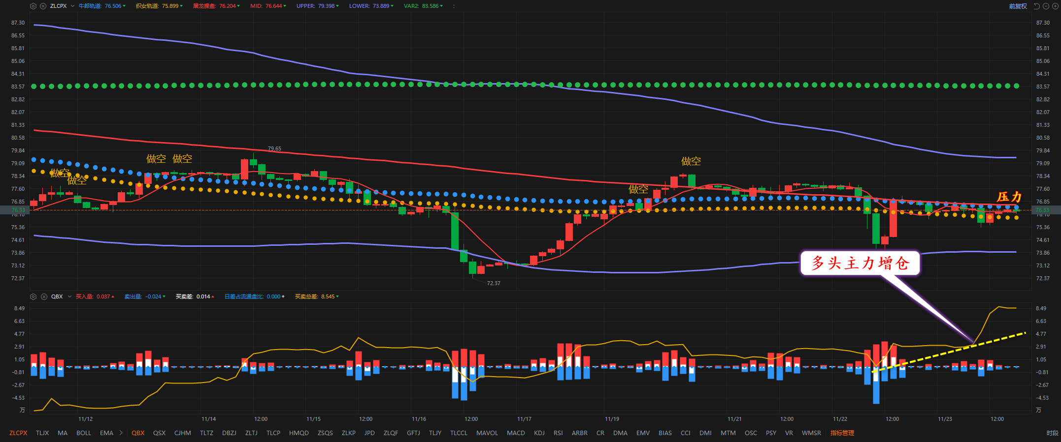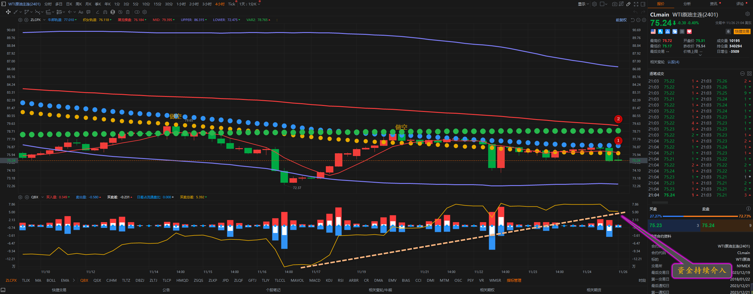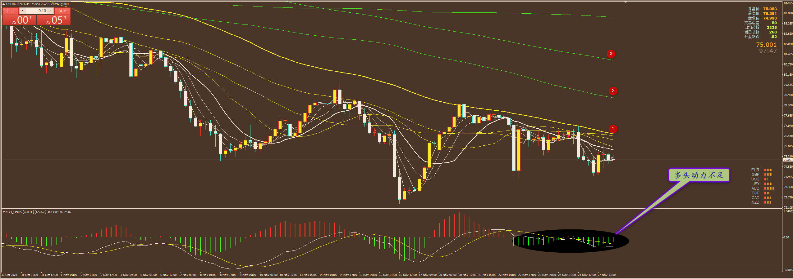 通过对原油4小时图解析得知,上一个交易日行情继续在上方的双轨压力位受阻回落,我们从下方的附图可以清楚的看到多头主力资金出现了持续介入迹象,说明有部分主力有抄底动作,正如我们上周所说要在底部区域继续震荡筑底,短期上方我们继续做嗲你关注12号的压力,下方我们继续关注74.10和72.40的支撑,短期预计将会继续窄