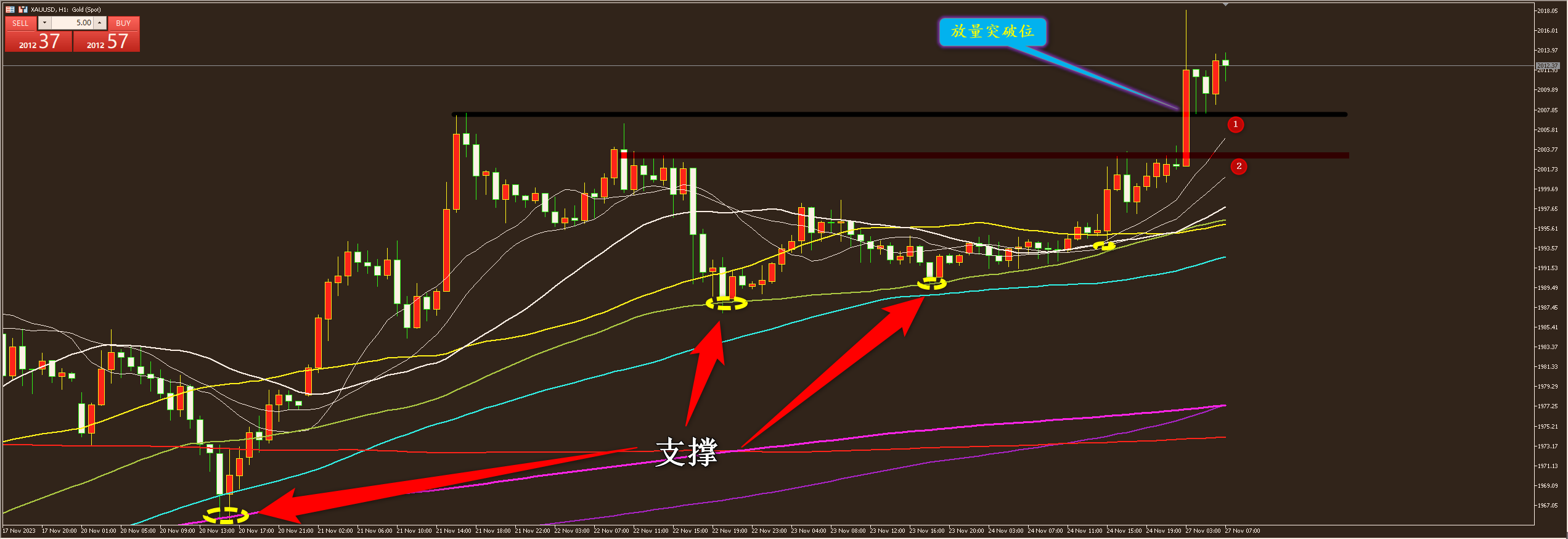 通过对黄金小时图解析得知,黄金如期放量突破上方2009一线的压力位,前期就已经说过大方向上涨不变,操作上重点逢低做多,在前期回落到下方均线支撑位的时候都得到了有效性的支撑,目前前期反弹的高点位置已经反过来成为短期的支撑12号位,短期上方短期压力2022依然是压力,短期上涨方向不变,在操作上我们继续重点逢低