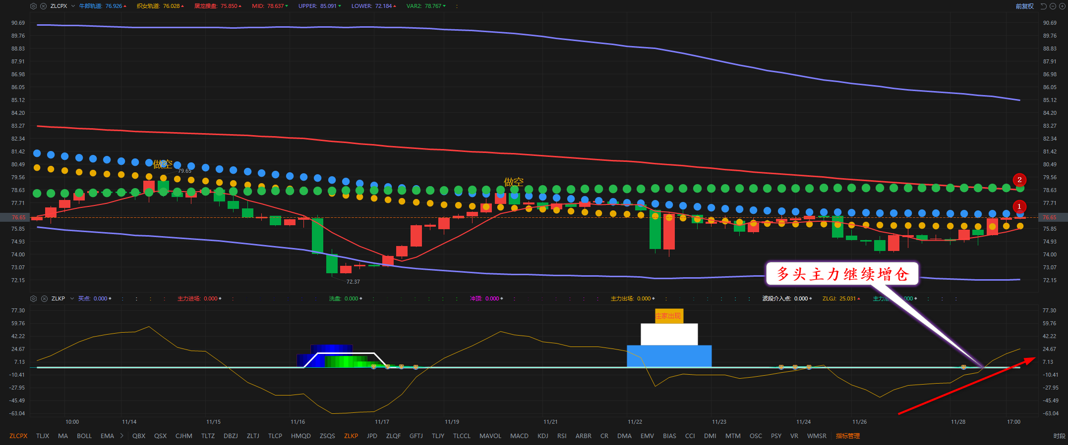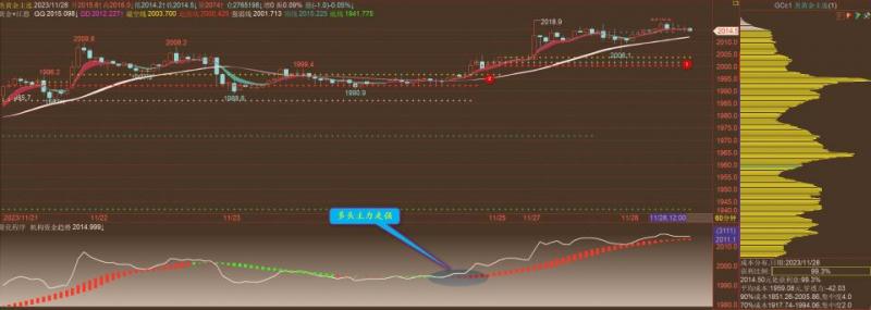 通过对原油2小时图解析得知,昨日行情先跌后涨,昨日在上方布林带中轨的位置受阻回落,晚间再次反弹上来目前已经再次到达布林带中轨一线,我们从下方的幅图可以清楚地看到多头主力继续增仓介入非常有可能要突破布林带中轨的压制,但不排除继续回落震荡调整运行为后期进一步的上行突破做准备,短期在操作上我们继续高空低