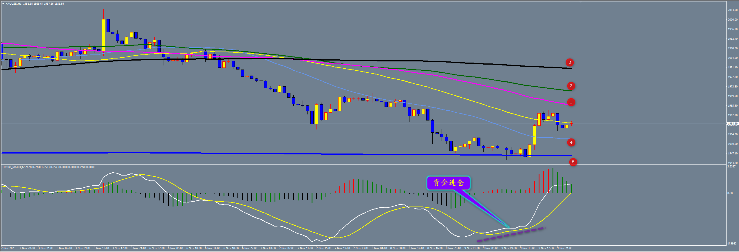通过对黄金小时图解析得知,昨日行情如期在下方5号均线支撑位止跌反弹,一度反弹到上方1966一线冲高回落,目前上方1966一线依然是短期的小压力(1号线),我们从下方的幅图可以清楚地看到昨日在下方5号均线支撑位可以清楚的看到已经形成了金叉并且红色多头能量柱开始增加,晚间进一步扩大拉升,短期上方所有的均线依然是