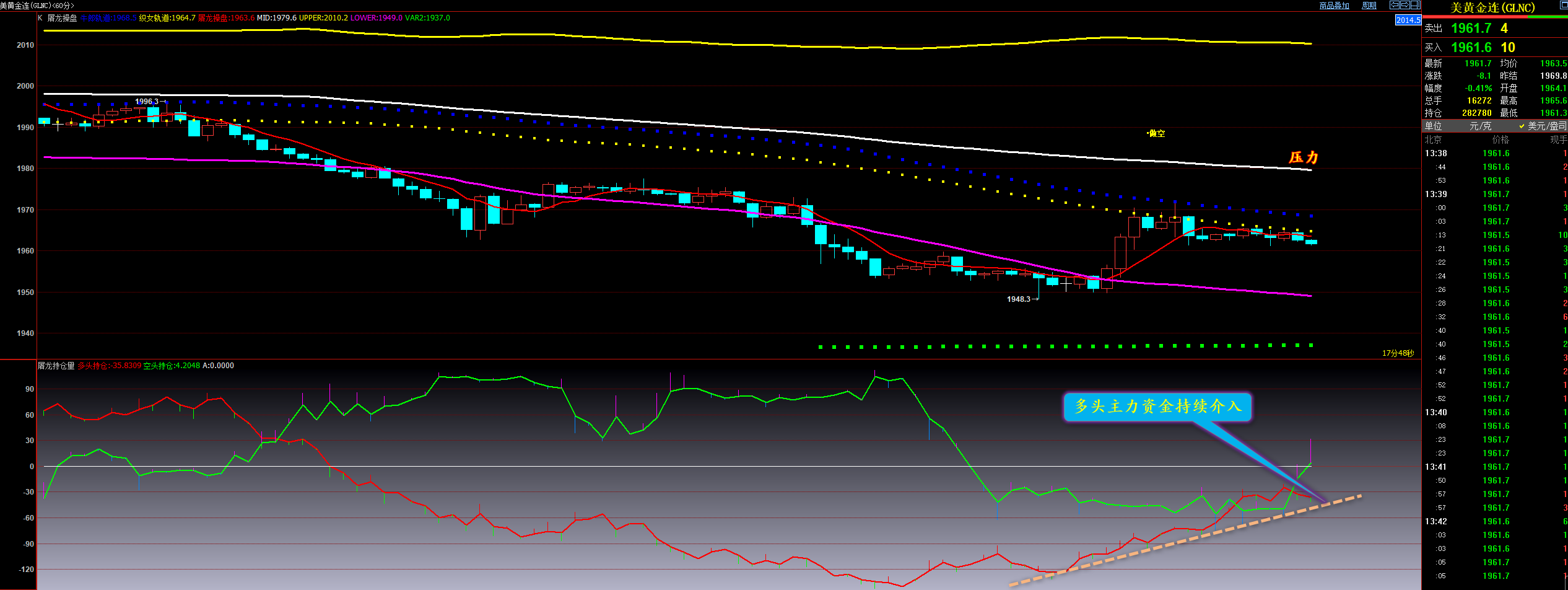通过对黄金小时图解析得知,黄金从早盘到目前为止一直在小幅震荡调整,昨日反弹到上方的双轨压力位受阻回落,我们从下方的附图中就可以清楚的看到,昨日之所以会出现反弹,行情在创新低的过程中多头主力不断地增仓介入,到目前为止依然处于增仓的状态,短期上方我们重点关注布林带中轨的压制在操作上我们继续高空低多思