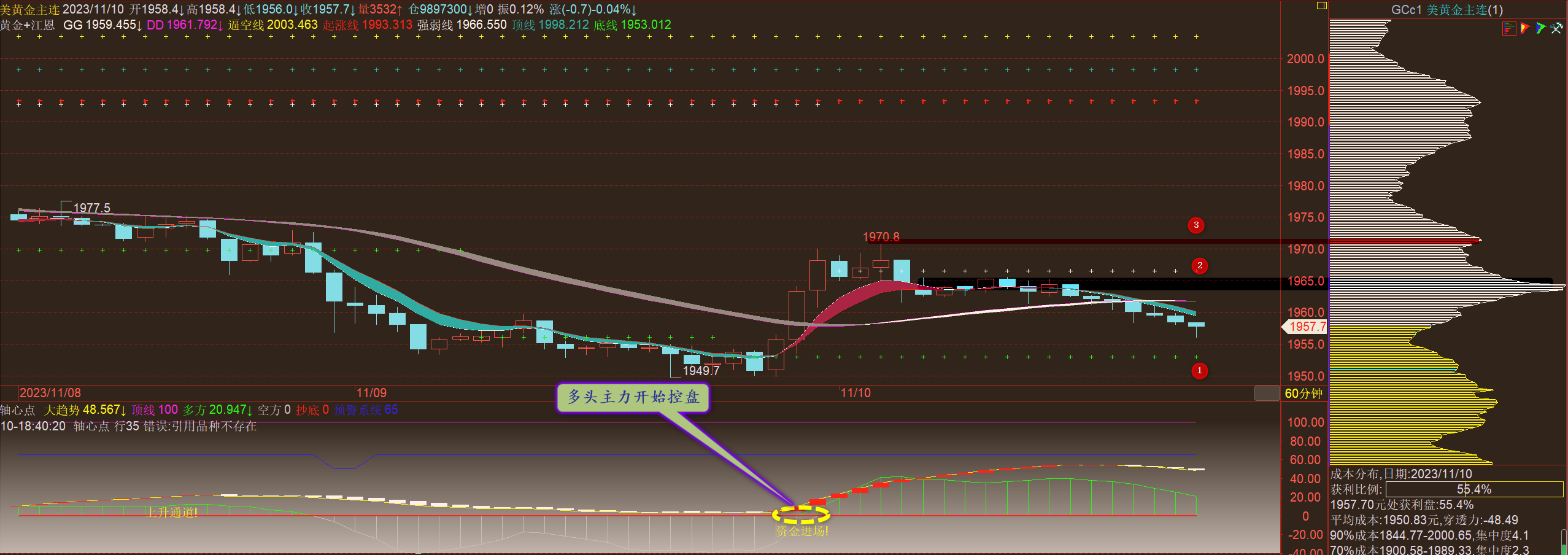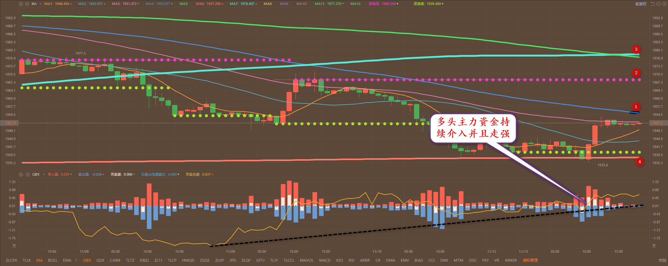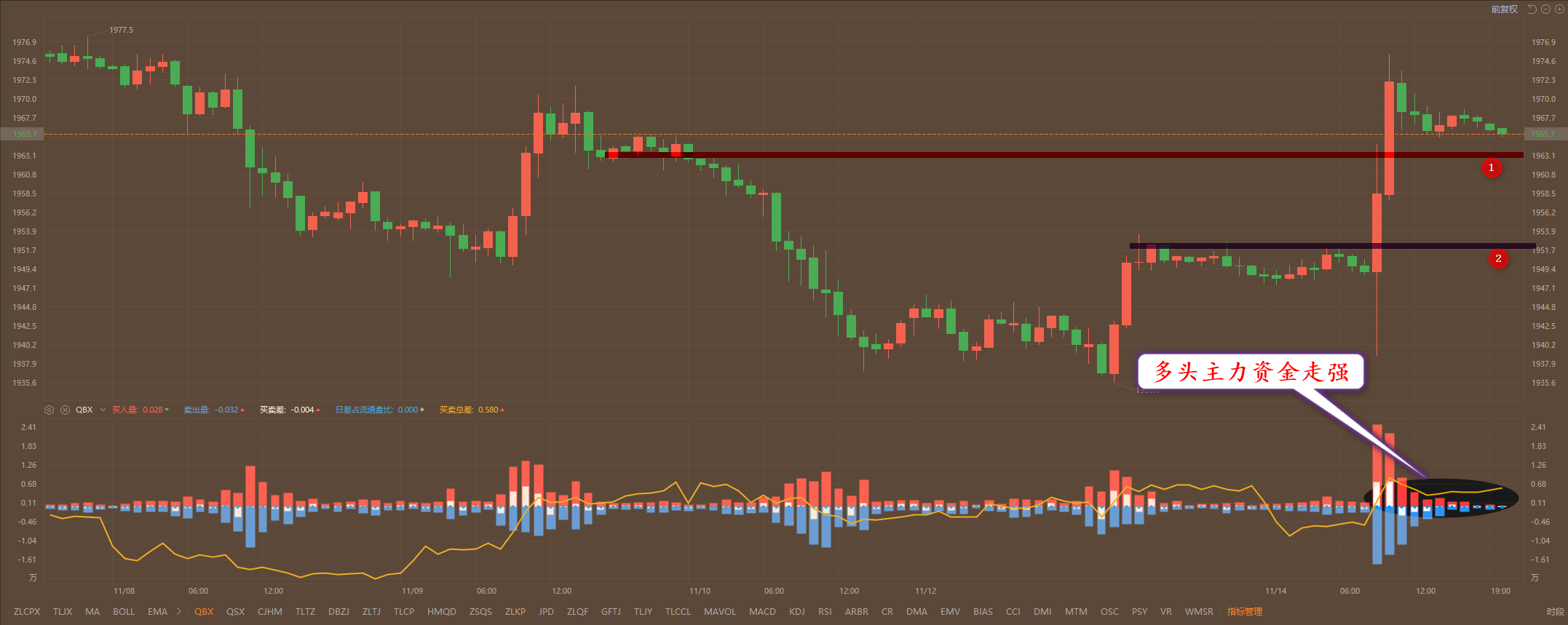 通过对黄金小时图解析得知,黄金从早盘继续冲高回落,目前在下方1951一线稍微有所反弹,中午的时候就已经说过短期应该是还要继续窄幅震荡调整运行,我们重点关注下方1号启动突破位的支撑,短期上方我们继续做嗲你关注23号的压力即可,我们从下方的附图可以清楚的看到目前已经处于多头主力控盘的状态,虽然有小幅调整动作