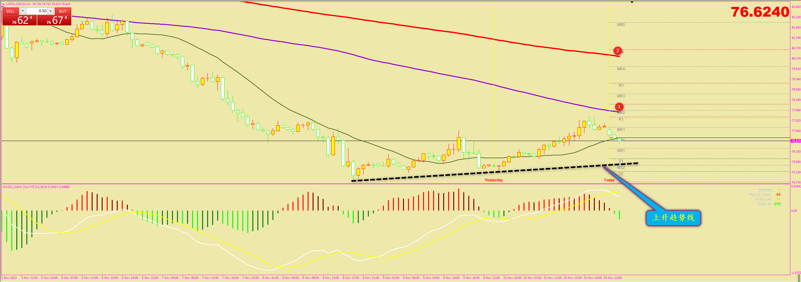 通过对原油小时图解析得知,上一个交易日继续延续反弹走势,晚间到达上方77.70一线受阻回落,目前一直回落调整中,短期有顶底抬高的动作,但是还没有反转,还需要进一步的震荡调整,短期下方我们重点关注上升趋势线的支撑,上方我们重点关注12号均线的压制,预计继续震荡调整运行,在操作上我们继续高空低多思路,具体建