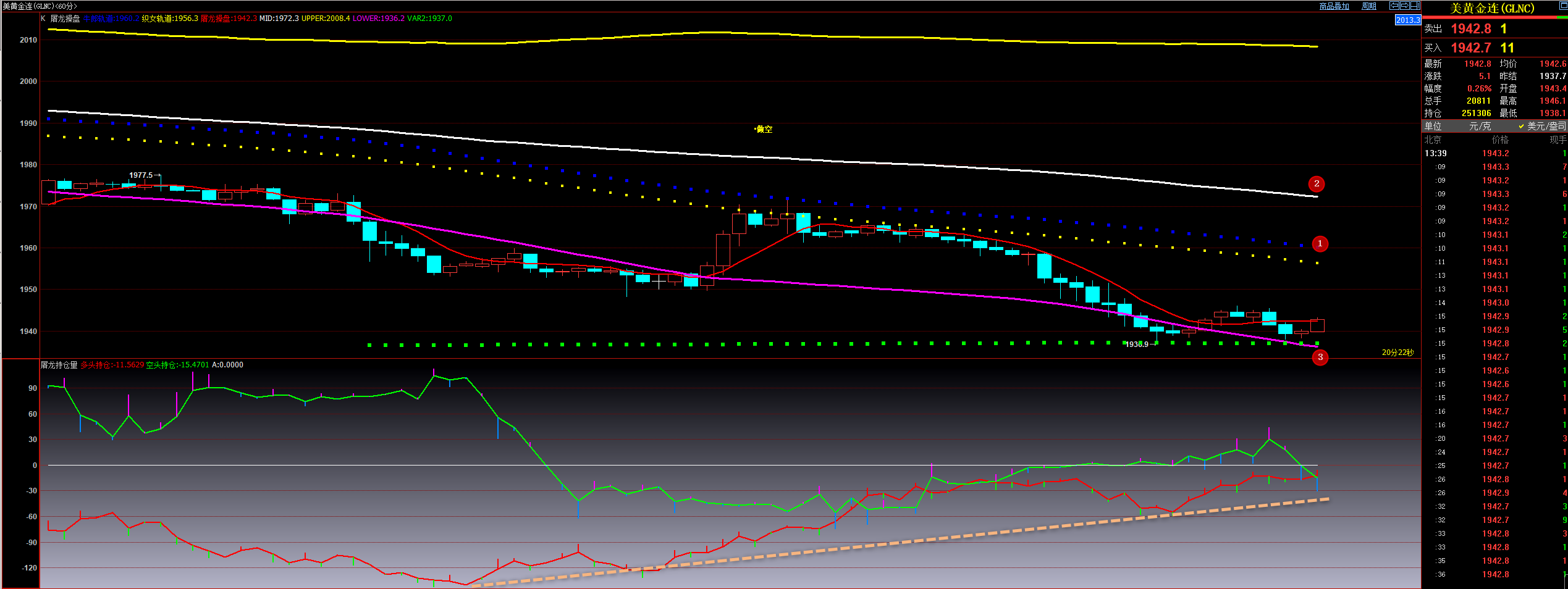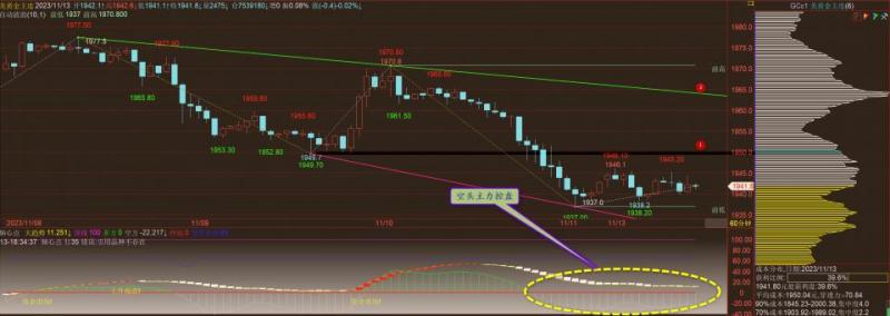 通过对黄金小时图解析得知,昨日行情如期在1931一线止跌反弹目前已经到达上周的底部位置的压力位相对而言机会有所调整动作,我们从下方的幅图可以清楚地看到多头主力资金从上周四持续介入今日并且已经走强,行情创新低形成资金的严重背离迹象昨日就已经说过,但是短期还没有形成反转,上方依然受制于123号的压制,短期将