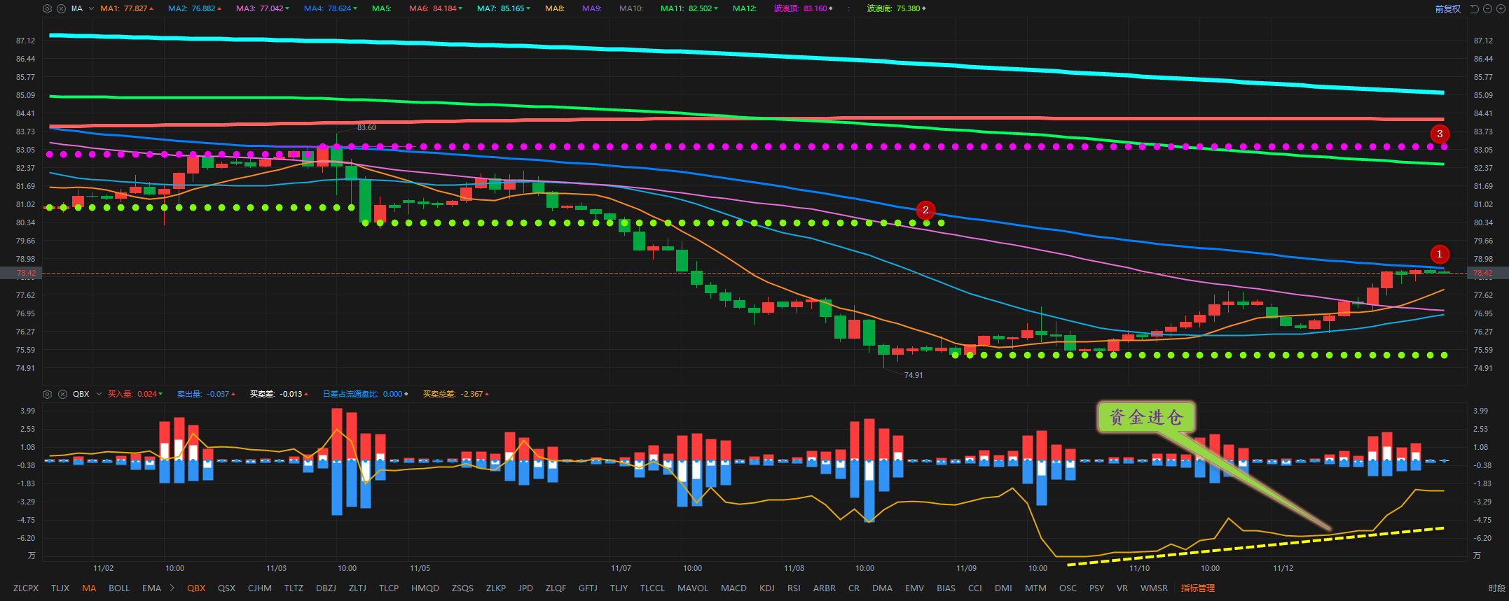 通过对原油2小时图解析得知,昨日行情继续延续反弹走势晚间到达上方79.70一线冲高回落,目前再次回到前期放量突破的位置1号位,我们从下方的幅图可以清楚地看到整体资金流已经进入强势区运行有继续向上突破的可能性,短期下方我们重点关注12号的支撑即可,以及上方34号的压力,预计将会继续向上反弹,短期在操作上我们继