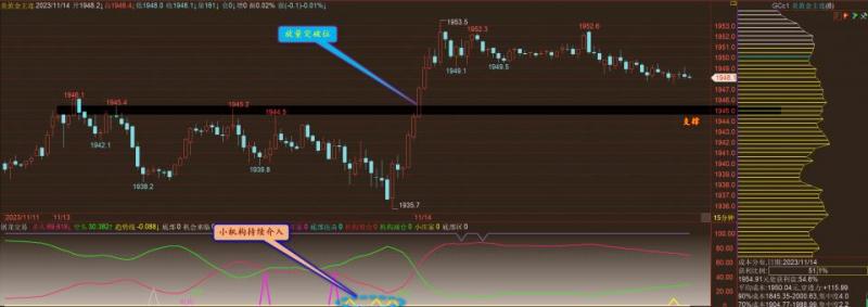 通过对黄金15分钟图解析得知,黄金从早盘冲高回落,目前即将到达昨日的放量突破位相对而言主力有一定的支撑作用,我们从下方的附图可以清楚的看到昨日启动上涨之前小机构持续三次在底部位置进仓,从而导致行情的进一步的拉升,昨日白天多次强调多头主力资金持续几天的进仓目的就是为了更好的拉升,短期上方我们继续重点