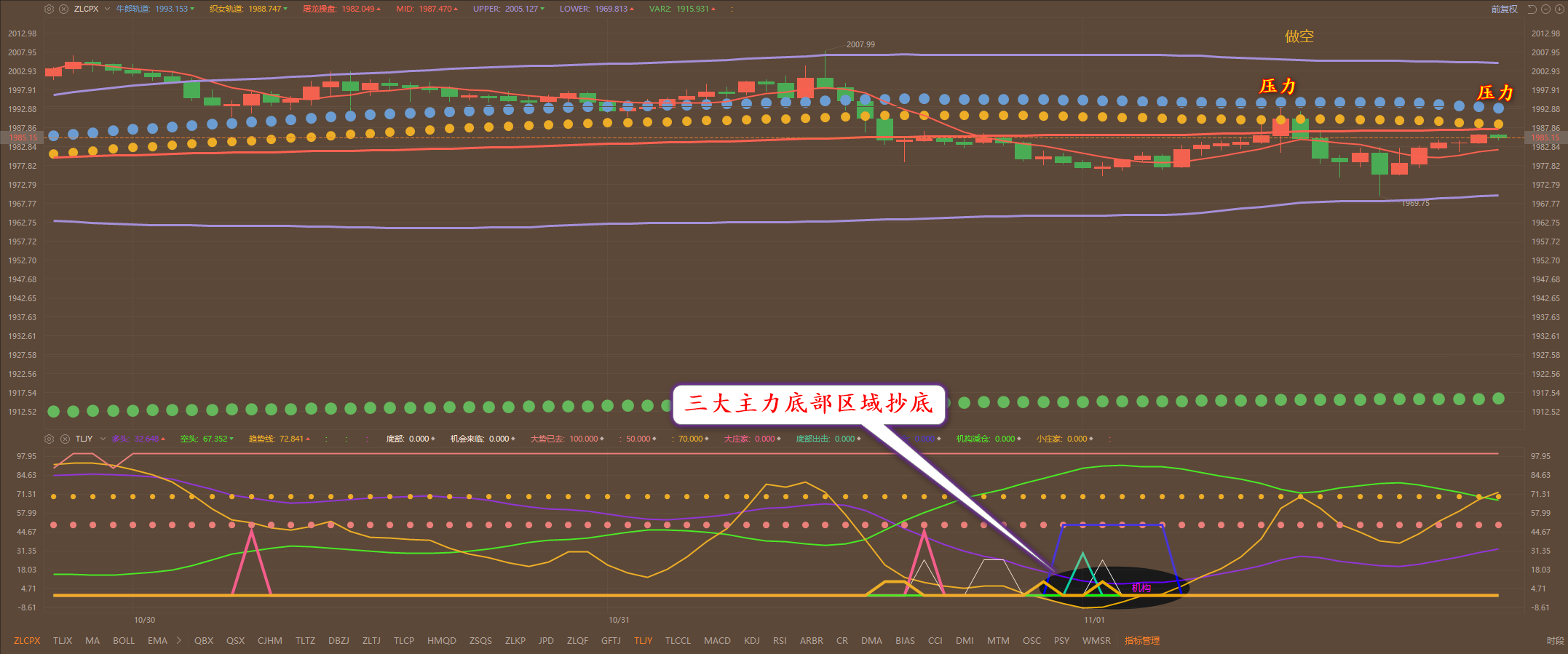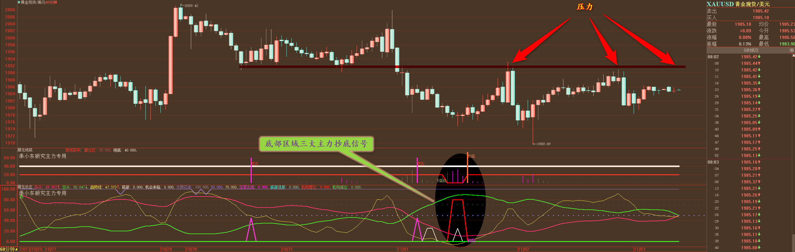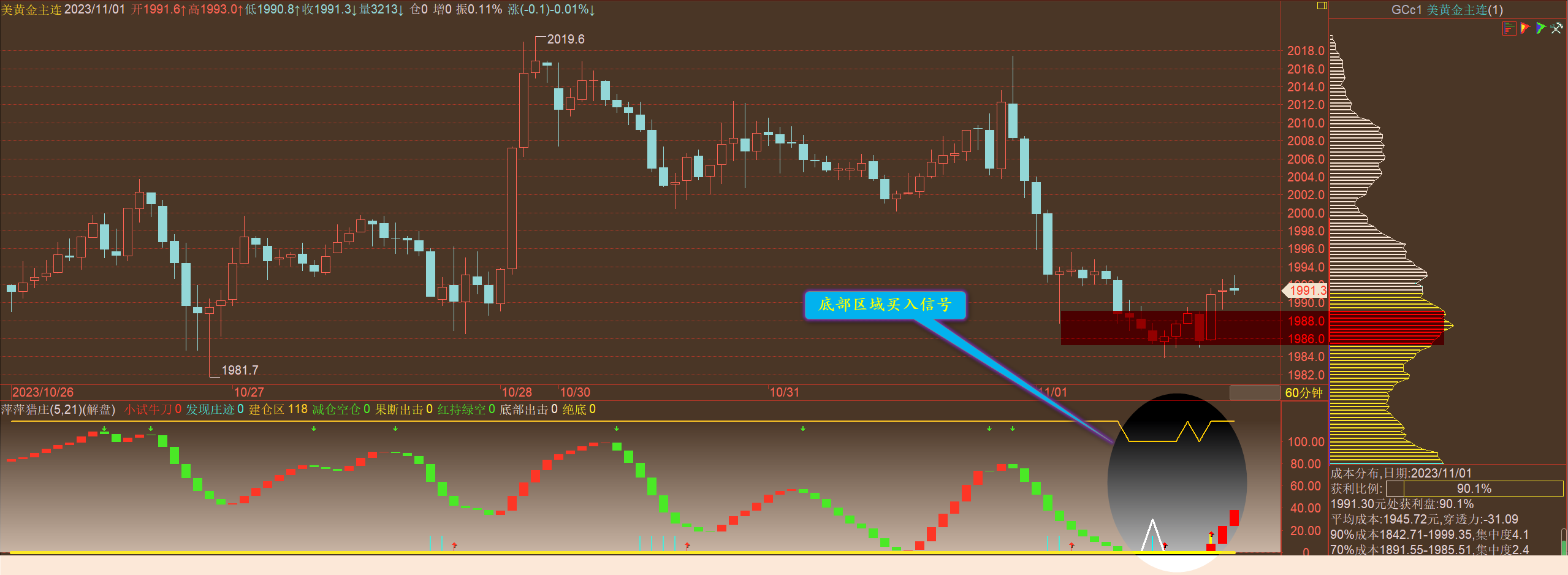 通过对黄金小时图解析得知,黄金在中午的时候就已经说过已经出现小机构抄底信号,如期已经小幅反弹了一波同时也是筹码峰值的支撑位,相对而言也是有一定的支撑作用的,我们从下方附图也可以清楚的看到已经出现底部信号和主力进仓信号,短期上方的压力依然是1989一线的样子,一旦放量突破将会继续上涨突破创新高,短期在