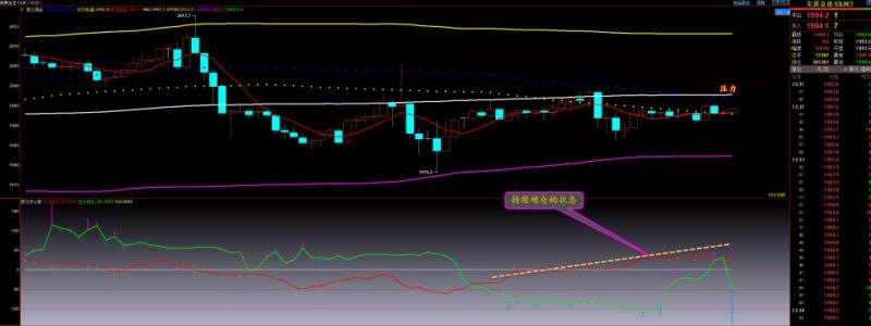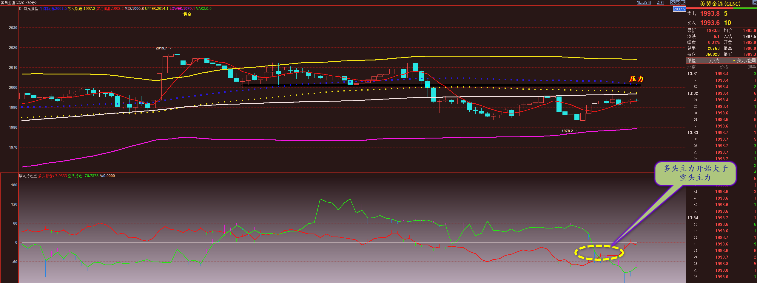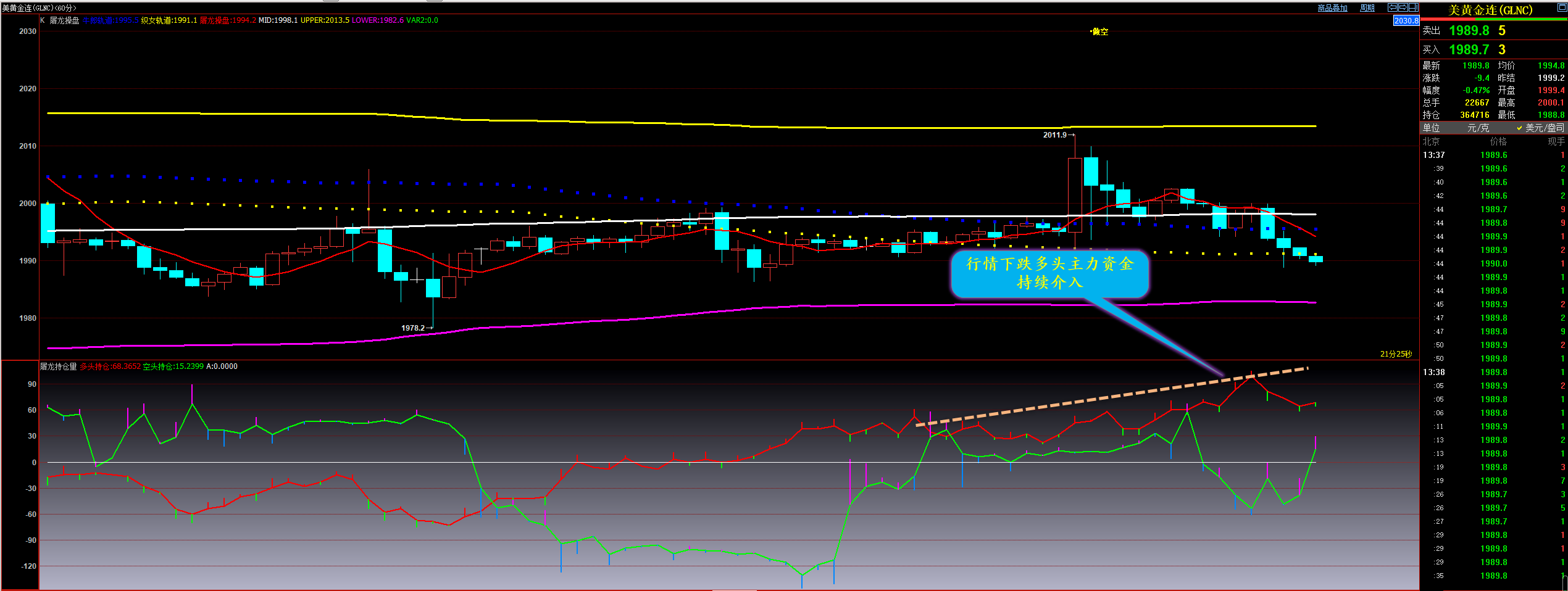 通过对黄金小时图解析得知,黄金从早盘到目前为止一直在1985附近窄幅震荡调整,我们在图中可以清楚的看到目前依然是在布林带中轨和双轨的压力之下运行,但是我们从下方的附图中已经发行多头主力不断地增仓介入,空头主力不断地出逃,并且多头主力开始大于空头主力,已经开始处于控盘的状态,短期上方的压力非常有可能的