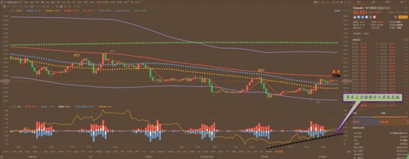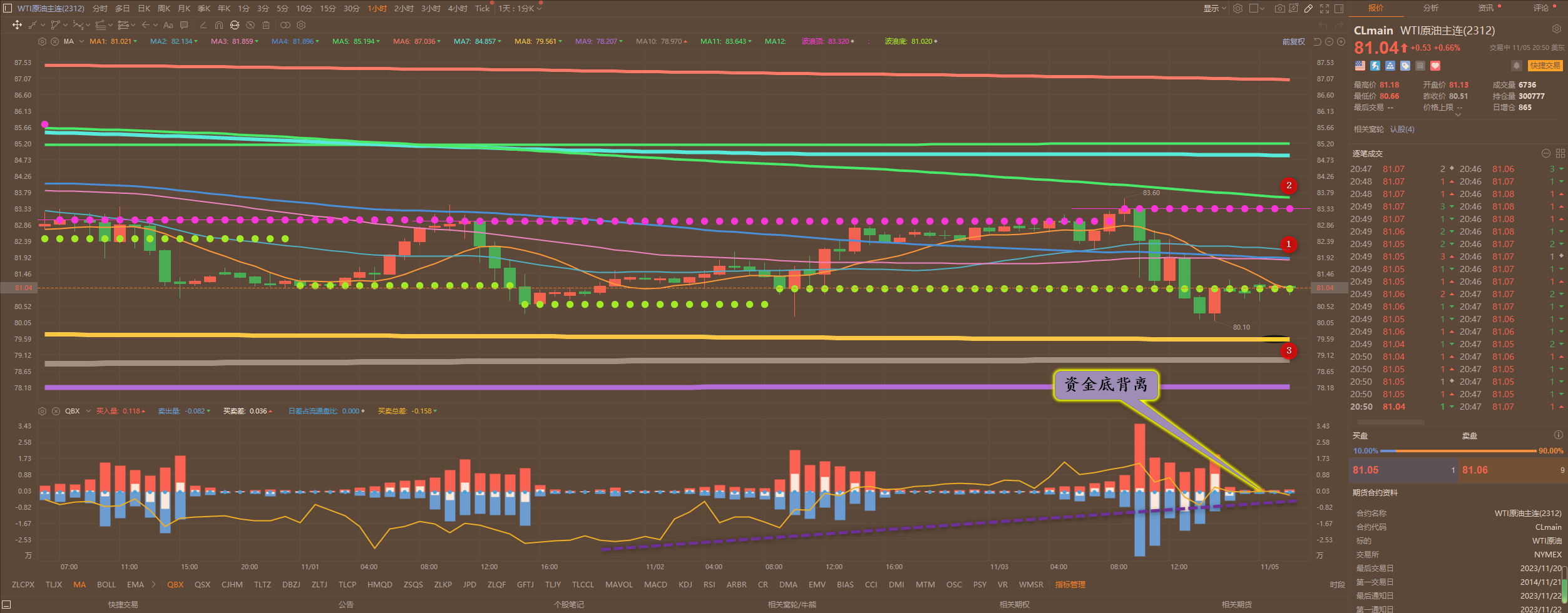 通过对原油小时图解析得知,上一个交易日先涨后跌,晚间到达下方80.10附近止跌反弹,目前依然反弹过程中,我们从下方的附图可以清楚的看到虽然行情下跌但是多头主力资金依然处于增仓过程中,但是不排除进一步下探,下方我们重点关注3号均线的支撑位,短期上方我们重点关注12号的均线压力即可,短期应该是要继续震荡调整