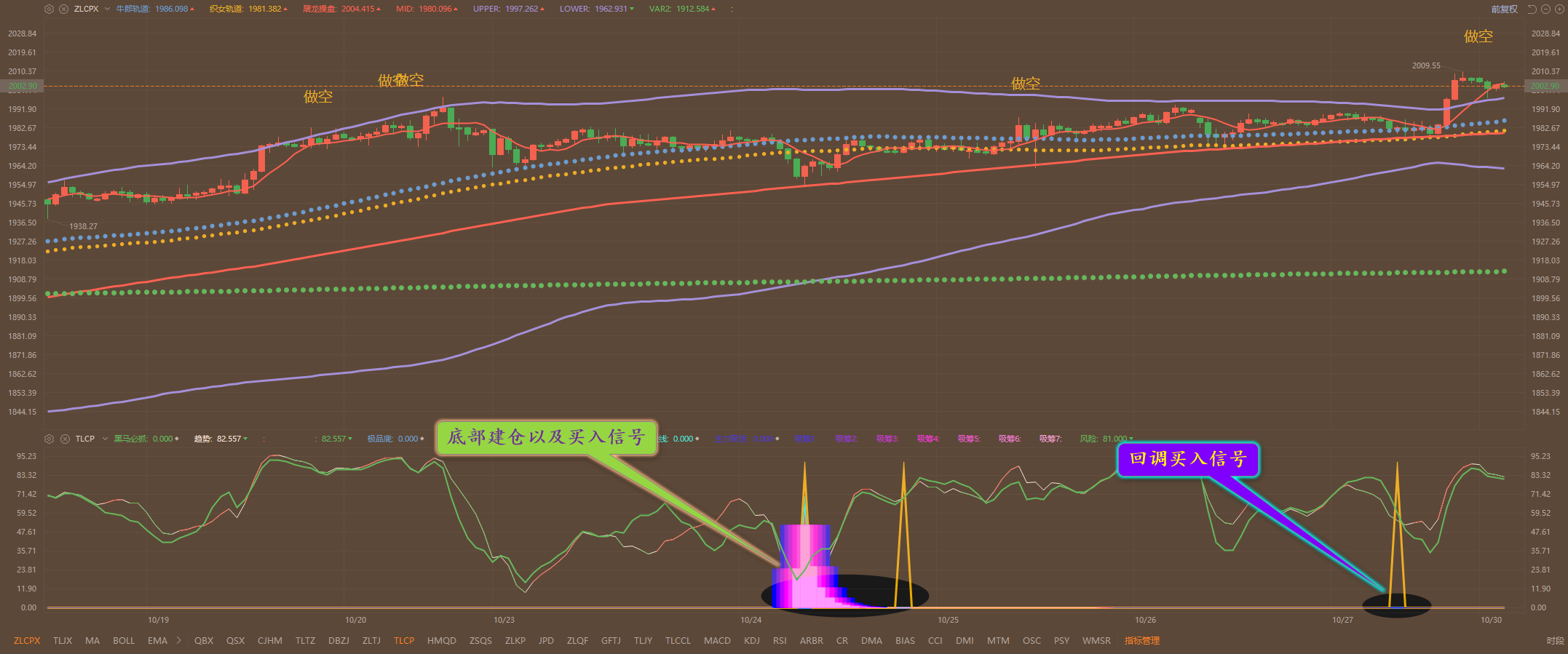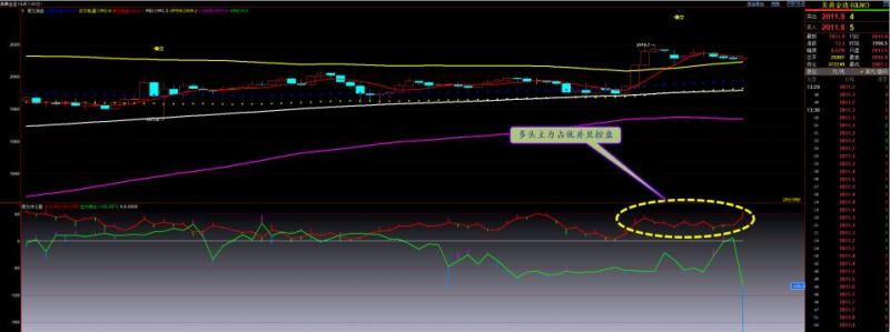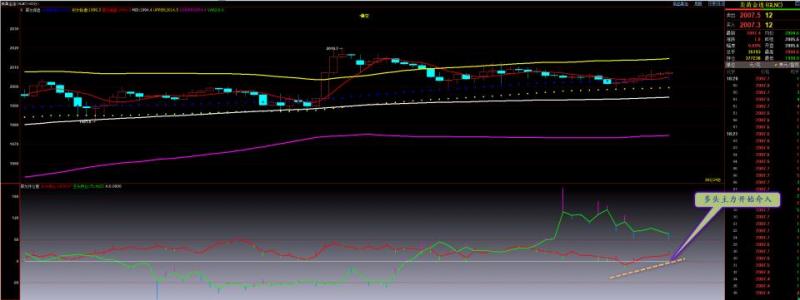 通过对黄金小时图解析得知,上一个交易日先跌后涨在下方布林带中轨的位置止跌反弹继续震荡上行突破符合我们的预期走势,短期上方2020依然是重要的压力位,我们从下方的幅图可以清楚地看到前期在底部区域就已经已经发现多头主力建仓布局动作以及回调买入信号,从而导致行情一直沿着布林带中轨继续向上突破说明多头主力的