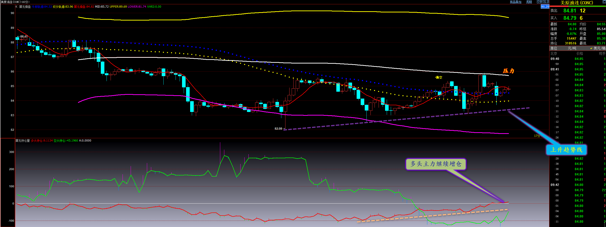 通过对原油小时图解析得知,昨日行情冲高回落盘中表现多头主力无力道,晚间一度到达下方81.80一线止跌反弹,我们从下方的幅图可以清楚地看到已经出现超级主力抄底信号相对而言短期就要反弹一波,短期上方我们重点关注12号的压力即可,预计将会在底部区域继续震荡筑底,短期在操作上我们继续先高空低多思路,具体建议如下