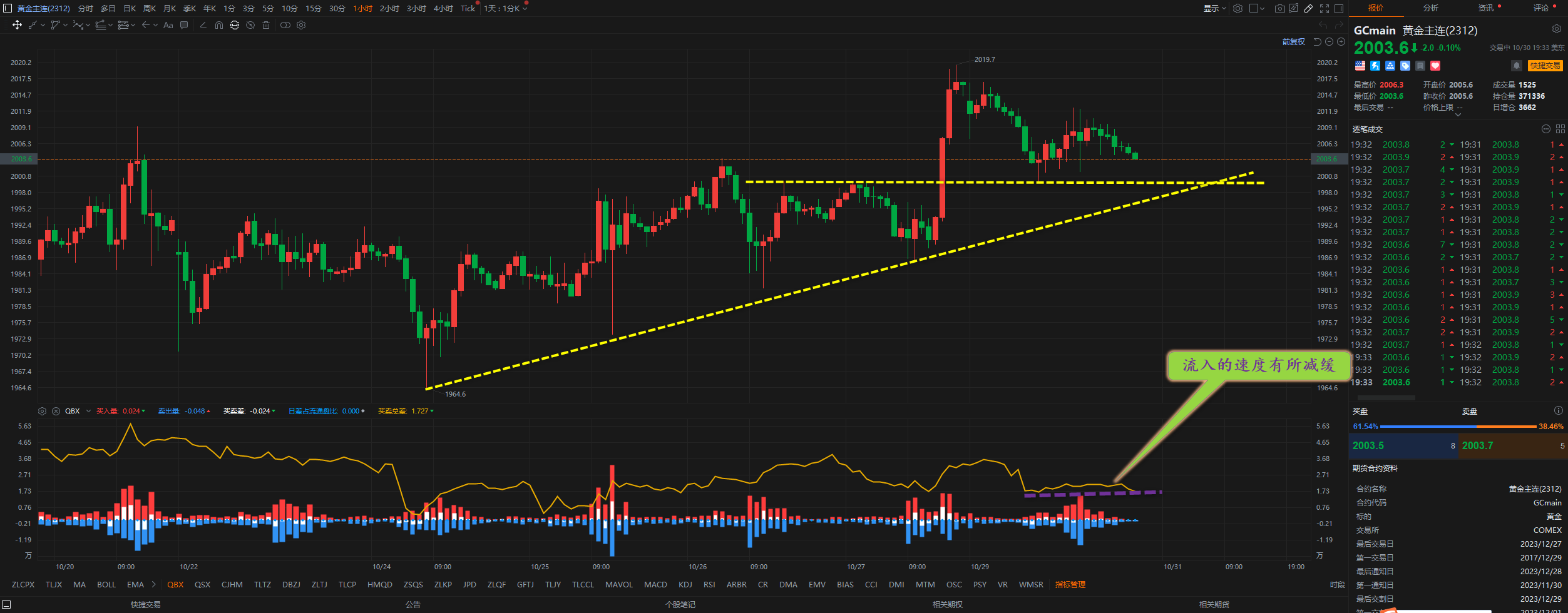 通过对黄金小时图解析得知,昨日行情冲高回落在下方1990一线(前期的反弹的顶部位置)止跌反弹,目前即将再次回到这一线盘中受数据影响不排除进一步下探到达下方上升趋势线的支撑,我们从下方的幅图可以清楚的看到在反弹的过程中有小幅资金流入迹象与前期而言流入的速度相对有所减缓,但是大方向依然上涨不变,我们上方