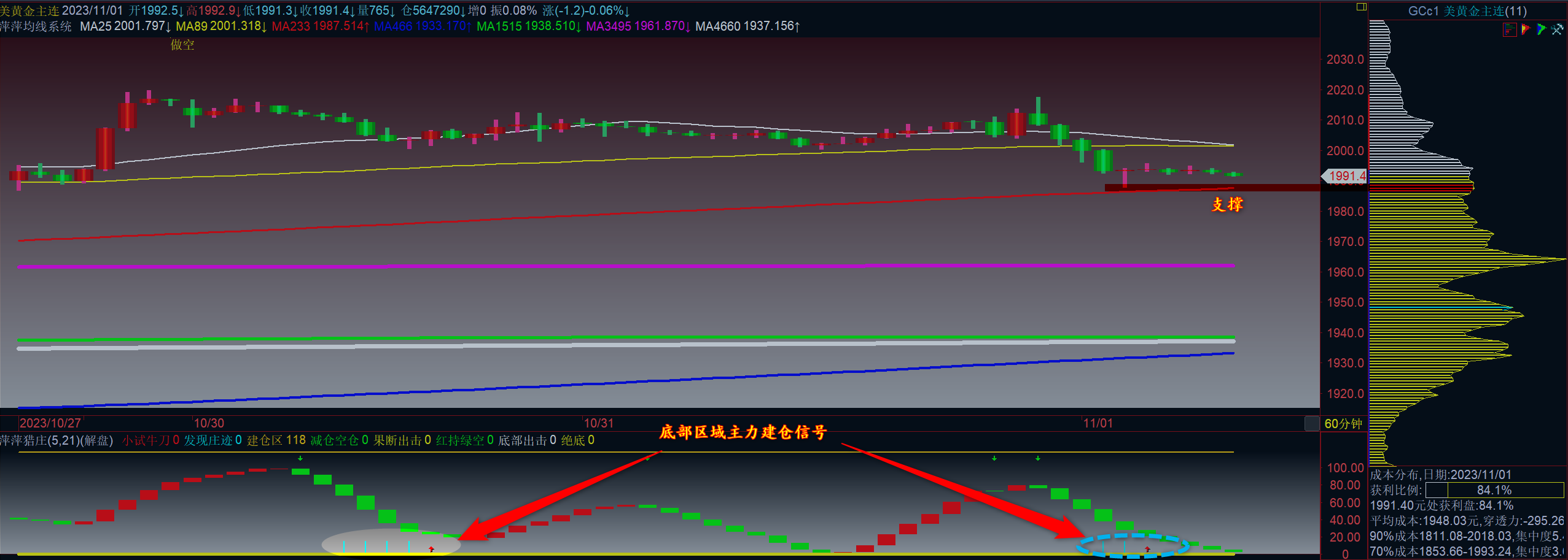 通过对黄金小时图解析得知,昨日行情先涨后跌如期到达下方1980一线到达下方的均线支撑位以及筹码峰值的支撑位相对而言也是有一定的支撑作用的,我们从下方的幅图可以清楚的看到在底部区域已经出现多头主力建仓信号,前两天的进仓信号的出现小幅反弹了一下,理论上今日应该也是要反弹一下,但是不排除数据影响进一步下探