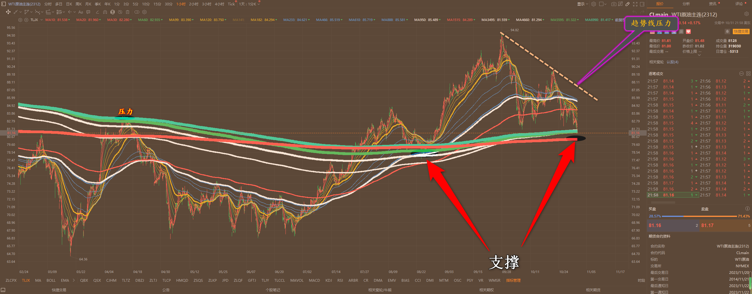 通过对原油小时图解析得知,昨日行情先涨后跌晚间再次下探到下方80.80一线,从主图上看已经再次回到重要均线的强支撑位,在前期下跌的过程中是压力,目前反过来已经成为支撑,虽然短期有继续向下的风险,从整体结构来看目前属于中期正常性调整的一个动作重要均线依然是向上运行,短期上方我们重点关注下降趋势线的压力即