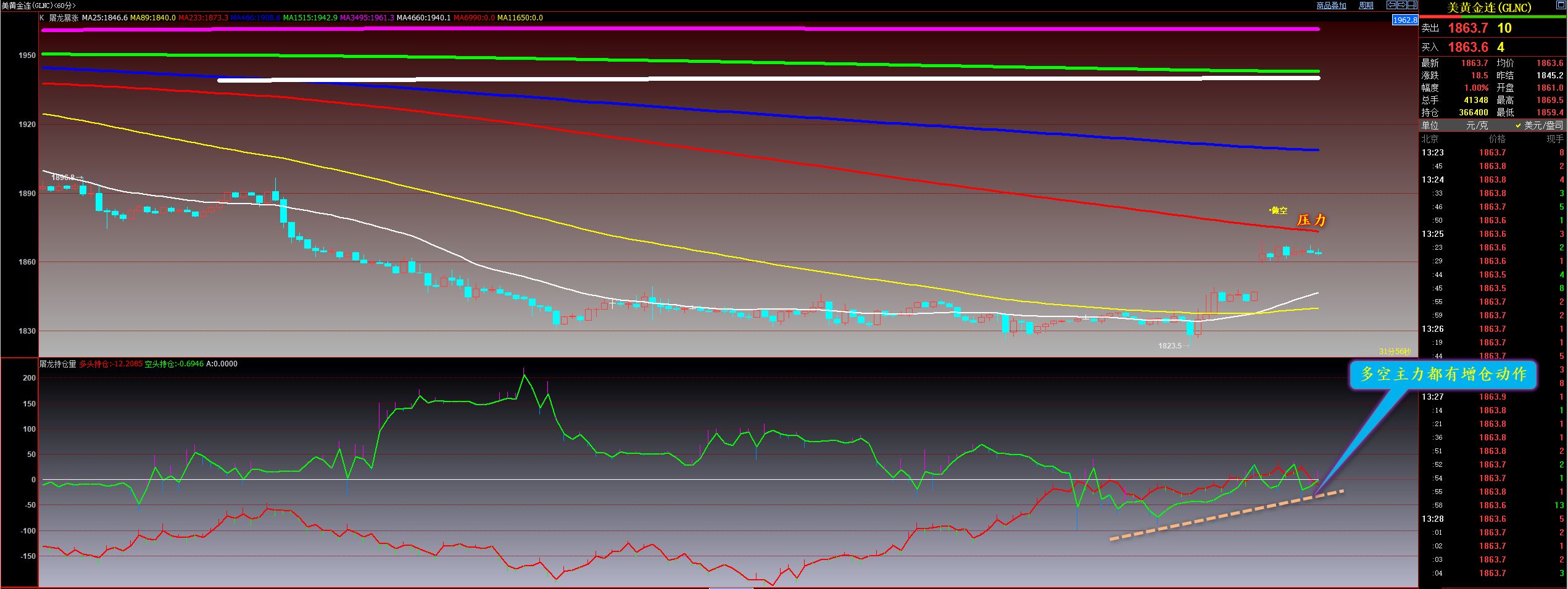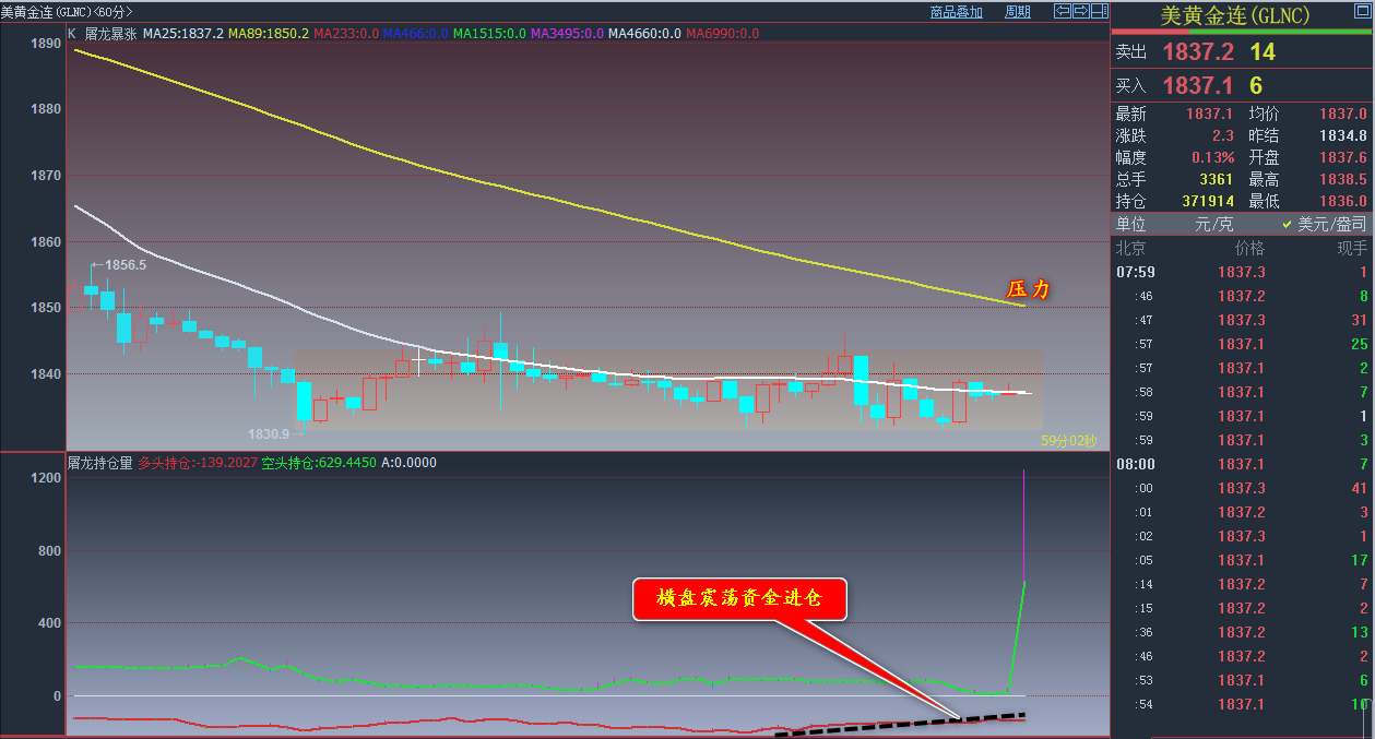 通过对黄金小时图解析得知,黄金从早盘跳空高开以来一直在高位震荡调整多空双方争夺比较厉害,我们从下方的附图也可以清楚的看到多空主力都有增仓动作分不清彼此,说明行情要在高位来回震荡调整,短期我们重点关注上方均线的压力位即可,在操作上我们高空低多思路,具体建议参考早盘策略