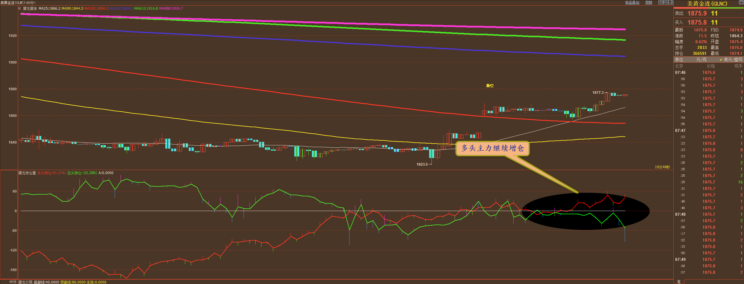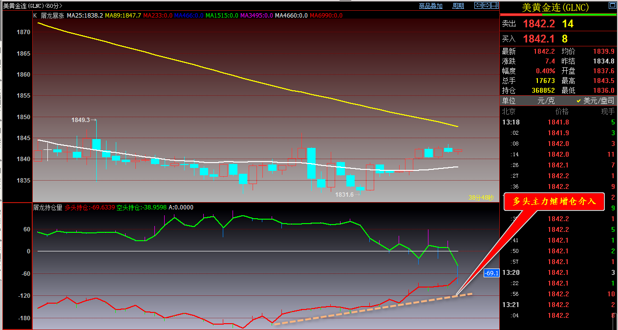 通过对黄金小时图解析得知,昨日行情如期先跌后涨晚间如期放量突破到达前期的底部位置压制,之所以会放量突破我们从下方的幅图可以清楚地看到多头主力一直是处于增仓的状态并且已经开始走强大于空头主力的力道,相对而言到达压力位有一定的压制作用,但是短期反弹的动能不减有进一步反弹的可能性,短期在操作上我们继续