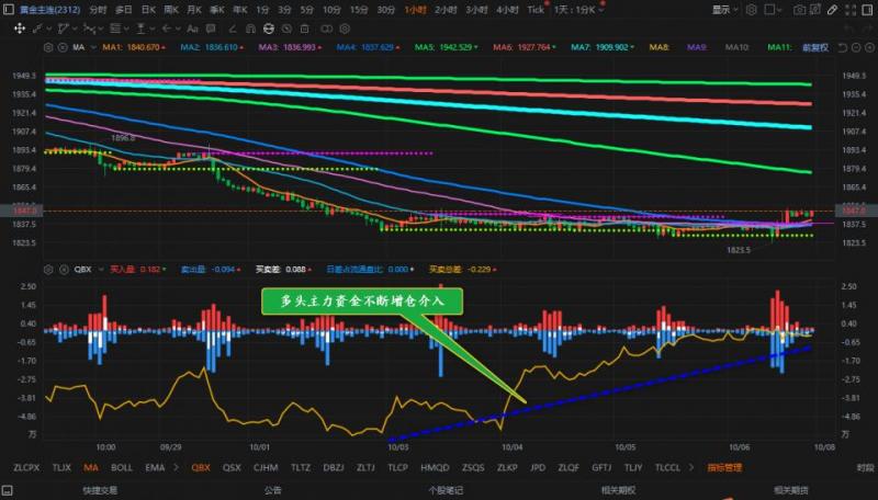 通过对黄金4小时图解析得知,上一个交易日先跌后涨,今日受外围数据影响跳空高开站上3号均线,我们从下方的幅图可以清楚地看到多头红色能量柱一直是处于增仓的状态但是短期依然是在零轴下方运行还构不成反转上方依然是受到均线系统的压制,短期继续震荡调整的可能性比较大一点但是不排除进一步的反弹,短期上方我们重点
