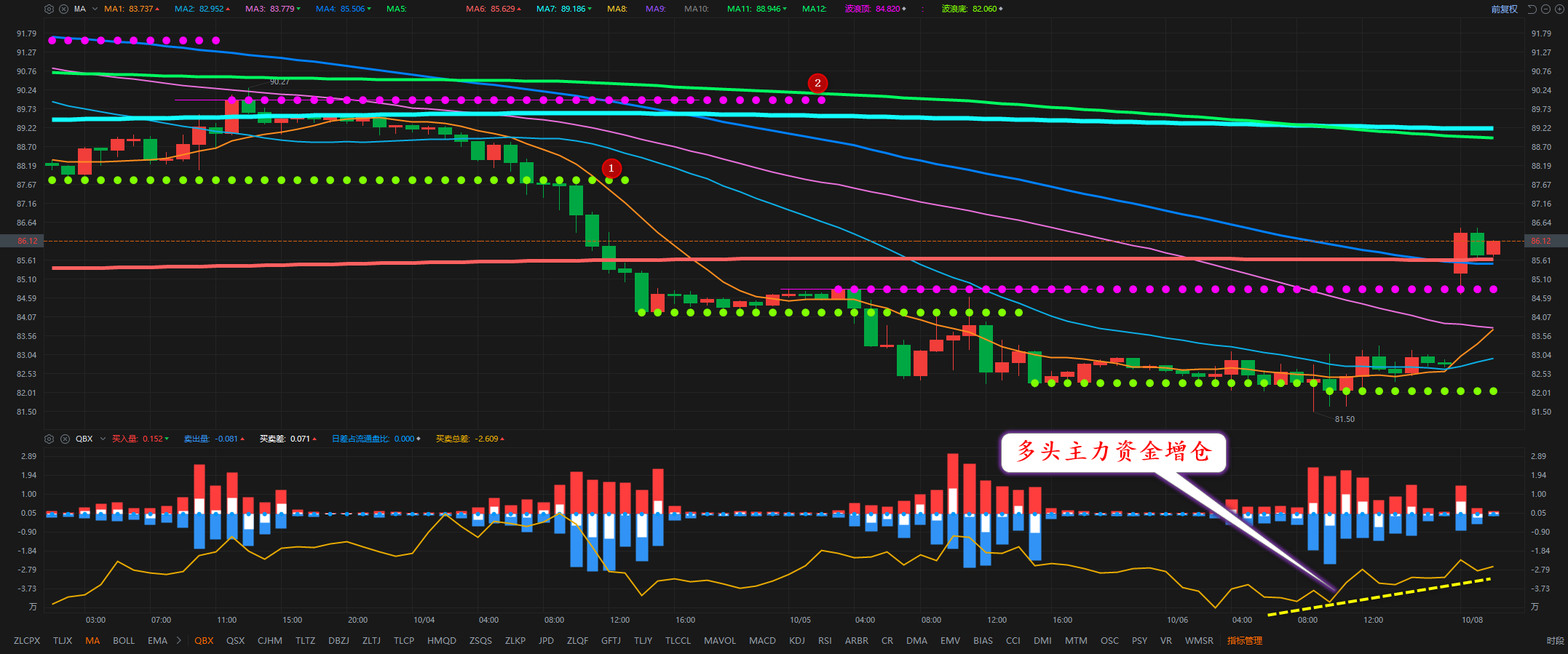 通过对原油小时图解析得知,昨日行情先跌后涨小幅反弹一下,到达上方的趋势压力线受阻回落,之所以会出现小幅反弹动作,我们从下方的附图可以清楚的看到下方有大资金进仓动作,前期有小资金进仓行情都相对而言出现了小幅反弹,目前相对而言反弹的力度可能要大一点,上方我们继续重点关注趋势线的压力,在操作上我们继续