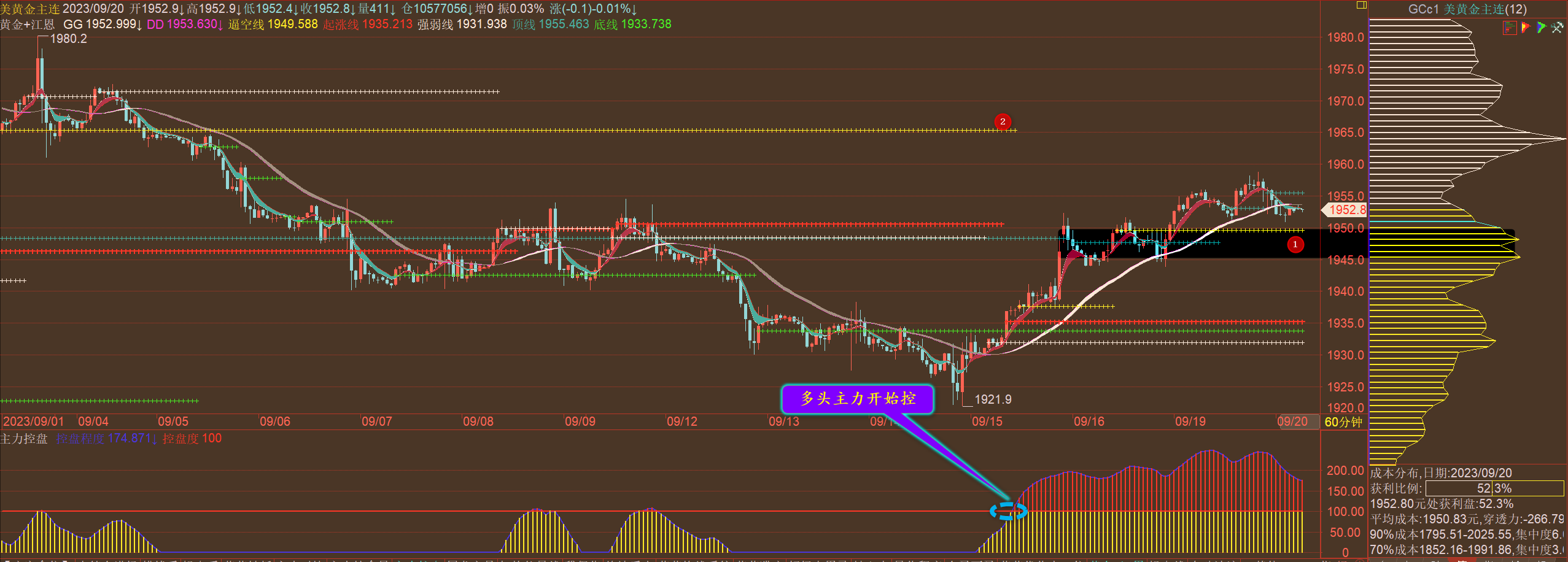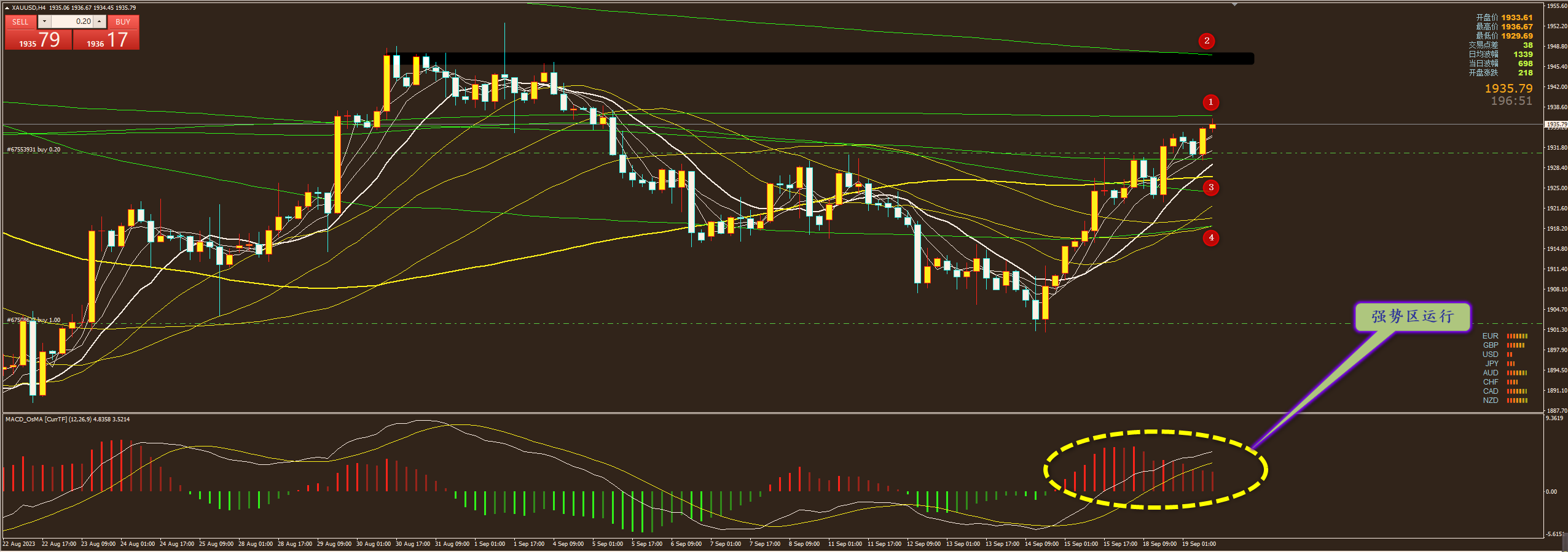 通过对黄金小时图解析得知,昨日行情在高位小幅震荡调整,有些出乎意料,拜登的讲话影响不大,但是整体走势和我们预期一样在上方1937一线受阻回落,我们从下方的幅图也可以清楚地看到自从多头主力开始高度控盘以来行情一路高歌已经突破并且站上1930一线的原先的压力目前反过来已经成为支撑,短期下方我们重点关注1号区间