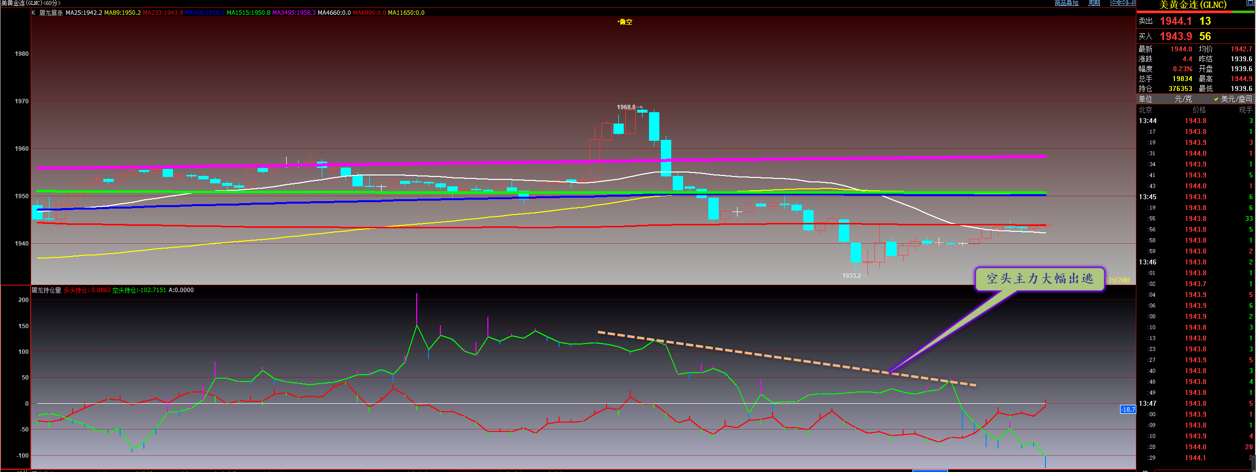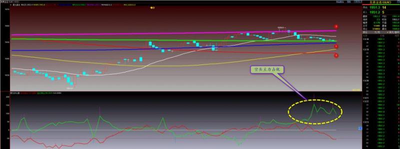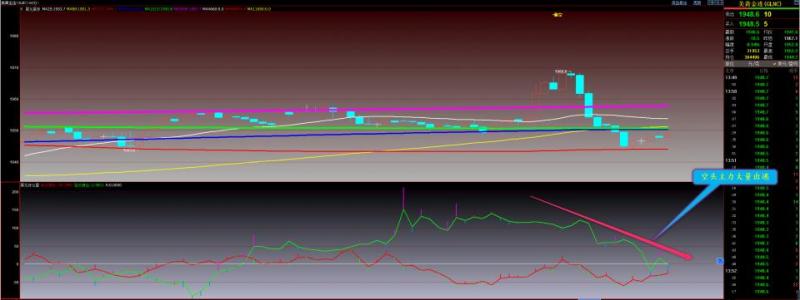 通过对黄金小时图解析得知,黄金从早盘到目前为止小幅反弹已经到达1925一线的均线压力位,自从黄金前日晚间开始冲高回落我们从下方的附图可以清楚的看到空头主力大幅出逃行情之所以下跌是因为多头主力出逃地更多,到目前为止空头主力依然是出逃状态,多头主力开始大幅增仓虽然上方受到1925一线的均线压制,非常有可能进