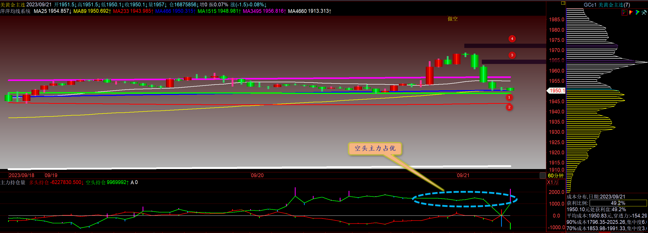通过对黄金小时图解析得知,黄金从早盘到目前为止一直是窄幅震荡调整运行状态在下方1号均线支撑位出现了止跌迹象,但是我们从下方的附图可以清楚的看到,行情之所以会出现冲高回落动作这两天空头主力一直是处于增仓的状态,多头主力小幅流出,说明行情非常有可能进一步的回落调整,短期下方我们重点关注12号的支撑即可,