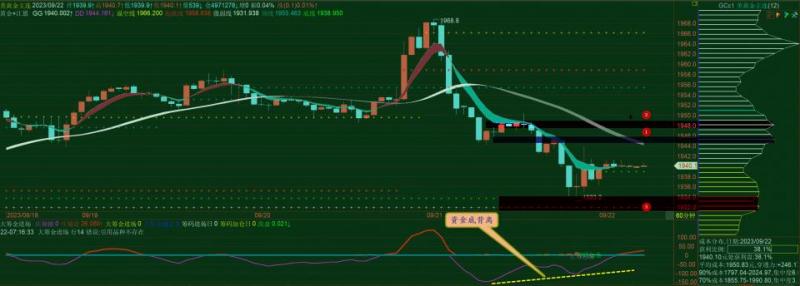 通过对黄金小时图解析得知,昨日行情先涨后跌在盘中反弹无力如期继续回落至下方1914一线止跌反弹,昨日在盘中就已经说过有部分多头主力资金进仓迹象,晚间受数据影响进一步下探下方支撑,我们从下方的幅图可以清楚地看到在底部区域已经形成资金的底背离迹象,盘中非常有可能进一步的反弹短期上方我们重点关注12号的压制