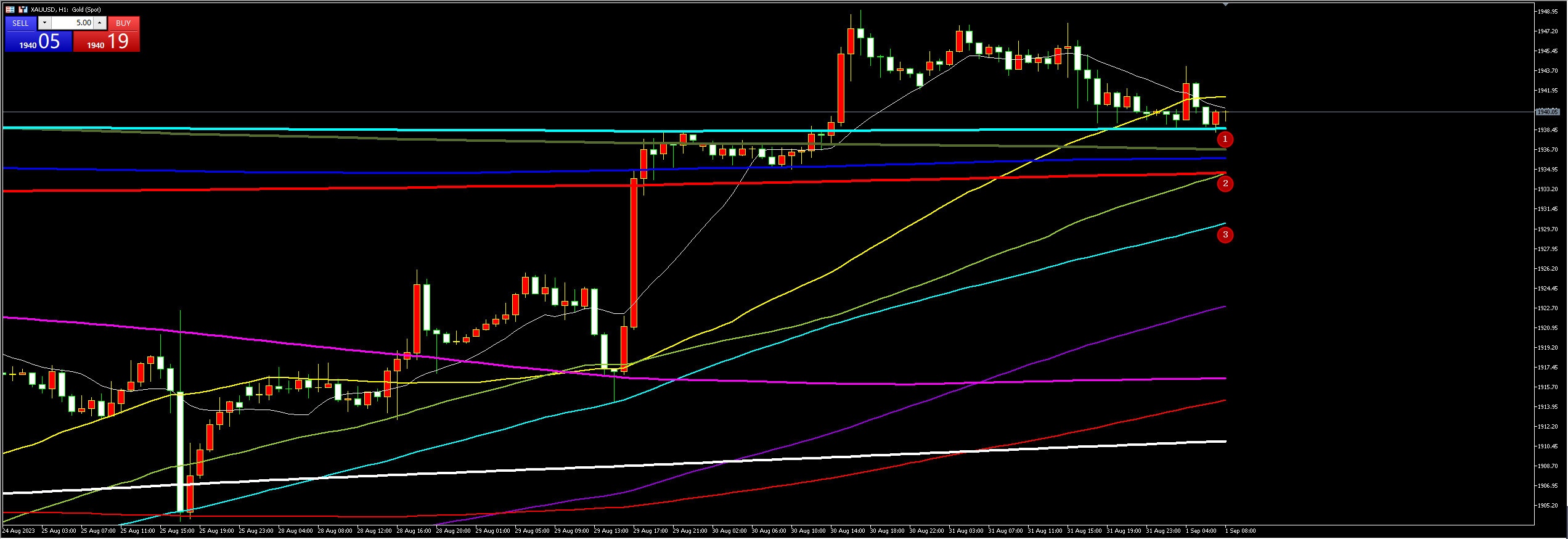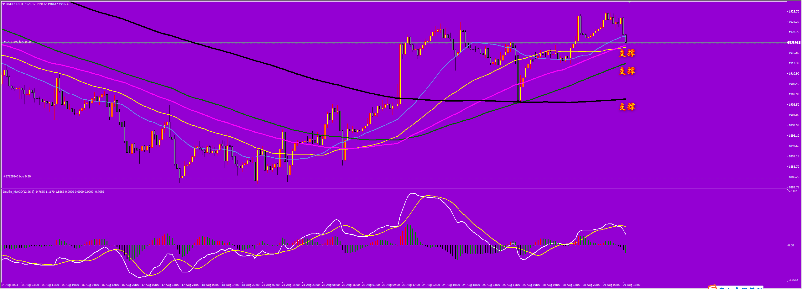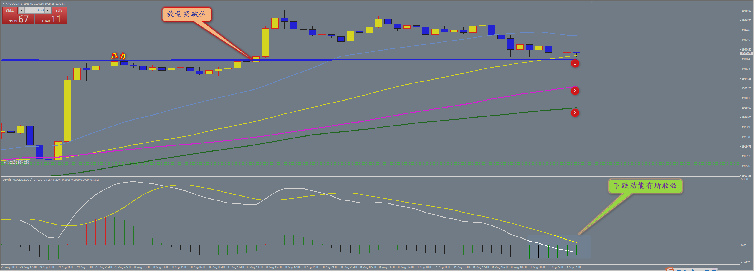 通过对黄金小时图解析得知,黄金如期到达上方1938一线从早盘到目前为止一直是下方整理,从下方的附图可以清楚地看到在压力位出现了一部分机构出逃信号说明短期有调整的需求,但是不排除进一步的拉升突破到达是否23号压力位,短期下方我们重点关注4号支撑,预计先跌后涨的节奏,毕竟短期已经形成上涨节奏,在操作上我们继