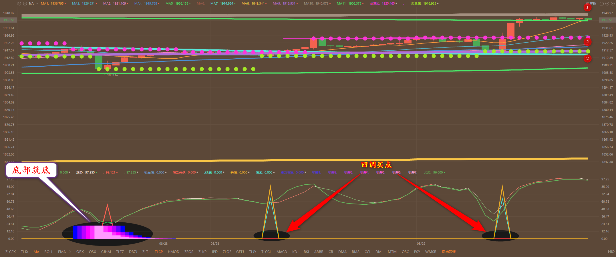 通过对黄金小时图解析得知,昨日行情先跌后涨,符合预期走势晚间回落到下方3号均线支撑位止跌上涨到达上方1938一线的均线压力位,目前有所调整,我们从下方的幅图也可以清楚地看到上周五回落调整到下方均线支撑位附近出现了多头主力布局动作盘中出现一波反弹动作,本周一在晚间盘中出现了回调买入信号再次形成上涨,昨日