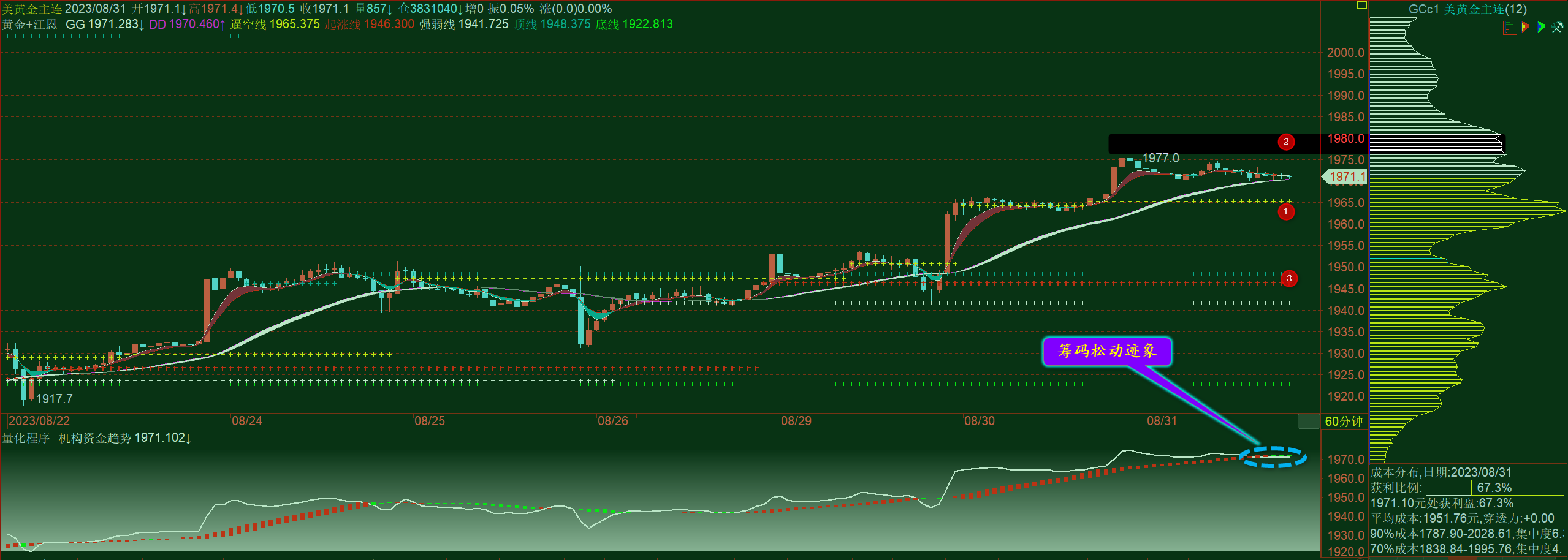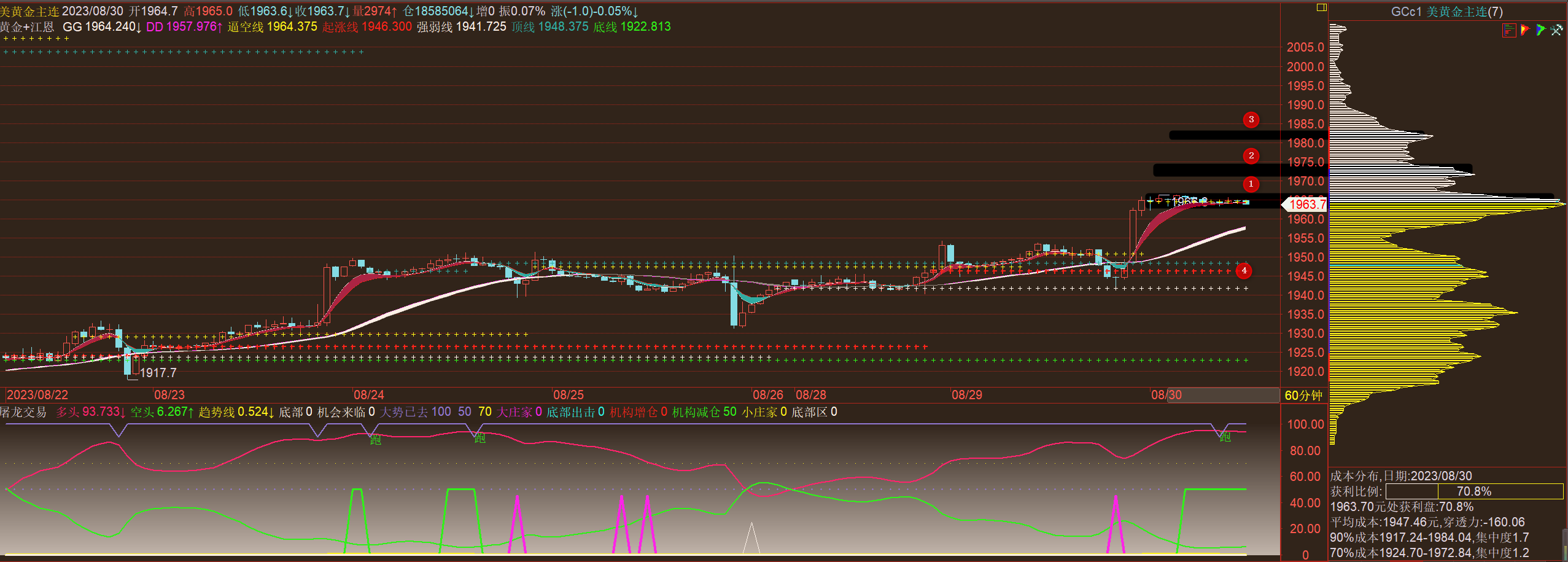 通过对黄金小时图解析得知,黄金从早盘到目前为止一直是处于窄幅震荡走势当中短期上方依然受制于2号区间压力(1952-1955),下方13号筹码峰的强支撑,相对而言力道比较强一点我们从下方的幅图来看多头主力机构有部分资金获利了结动作,不排除美盘时间段先跌后涨,但是上方的压力也是比较大一点,也是没有那么容易突破,