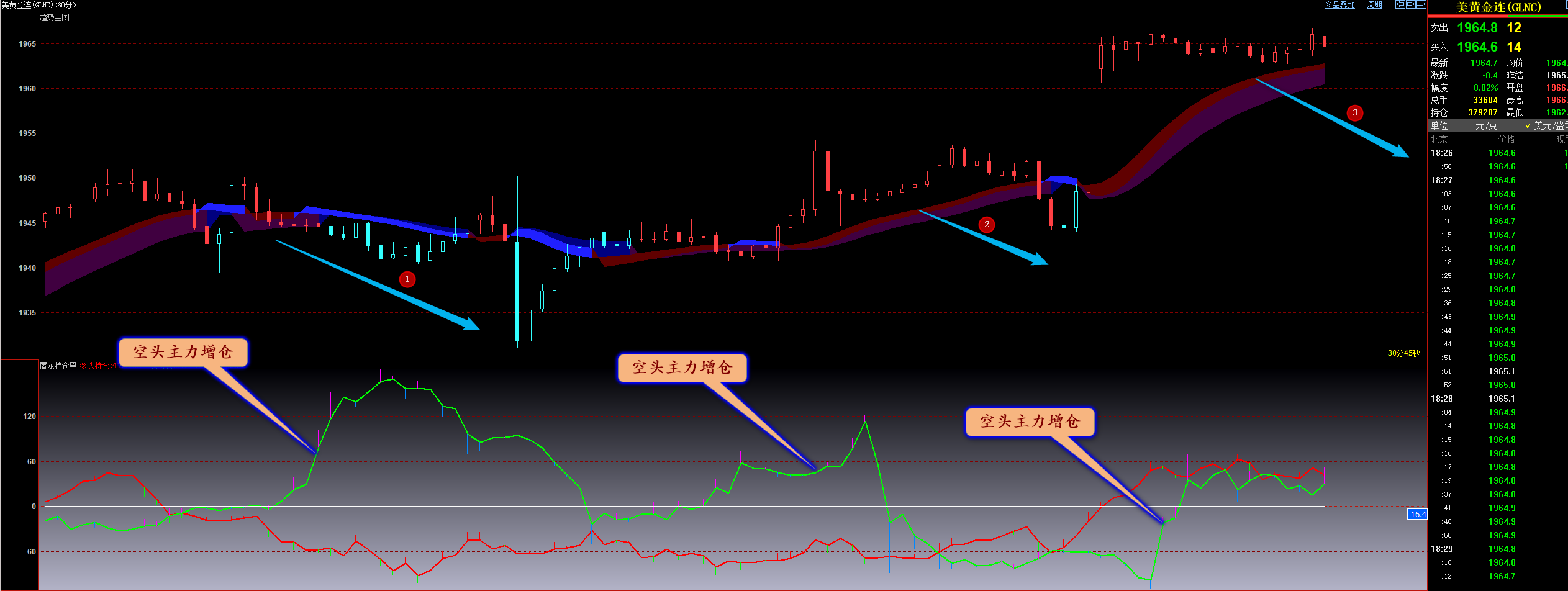 通过对原油小时图解析得知,昨日行情就震荡上行突破,上周就已经说过底部信号已经成立机会继续向上震荡上行,目前已经接近上一波的反弹高点位置附近以及高位均线的压力,下的雨也是有一定的压制作用的,行情之所以会出现一大波的反弹上涨我们从下方的幅图就可以清楚地看到在底部区域出现了大量的多头主力加仓动作一直加