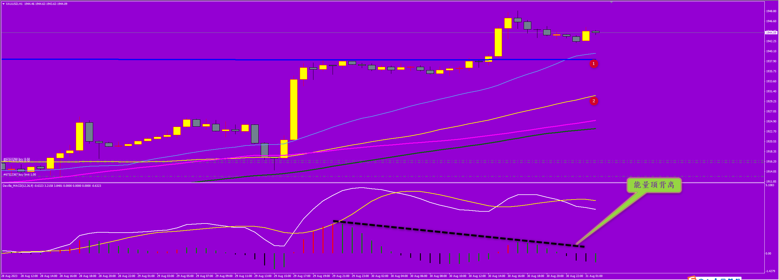 通过对黄金小时图解析得知,昨日行情继续延续上涨走势到达上方1949一线受阻回落,昨日盘中再次放量突破1号均线的压制原先考虑可能要调整一下再突破,目前多头主力直接选择突破,现在反过来1号均线已经成为短期的支撑以及下方2号均线都是支撑,我们从下方的幅图ACD可以清楚地看到短期已经出现了多头能量顶背离迹象,说明