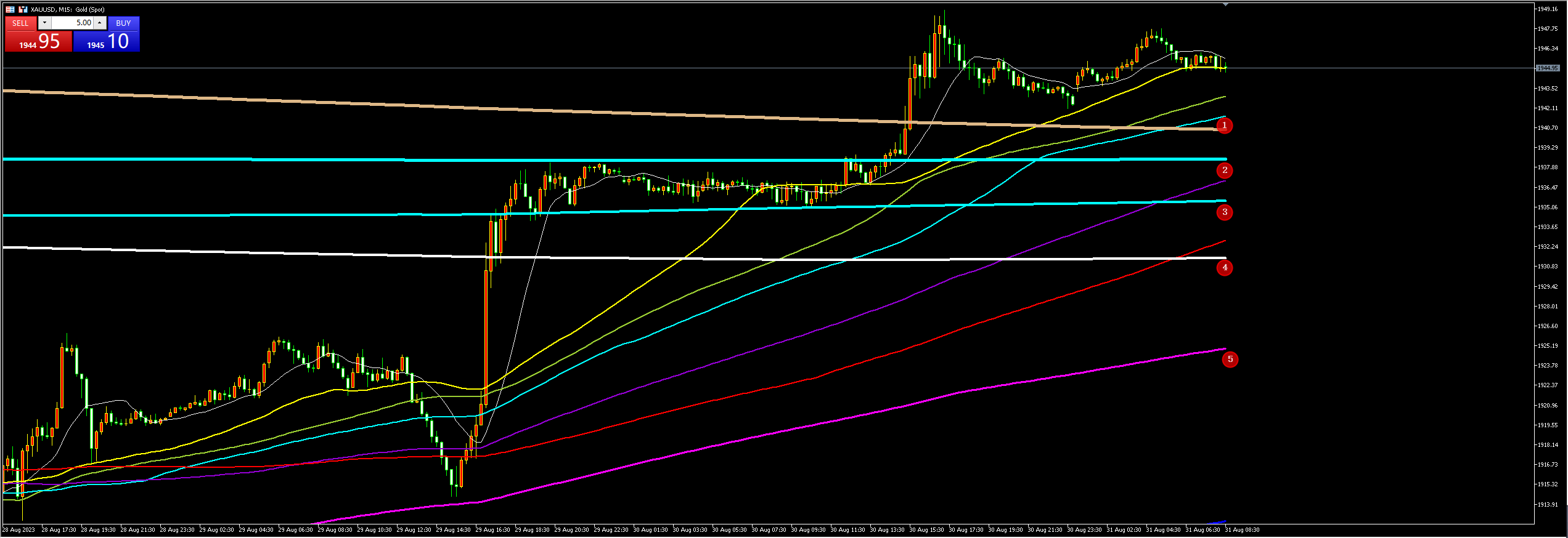 通过对黄金15分钟图解析得知,黄金再次和昨天一样在上方窄幅震荡调整,黄金多头主力接二连三的放量突破上方的重要压力位,目前已经反过来已经全部成为支撑,短期我们重点关注下方12345均线的支撑,短期的均线系统依然的向上运行,短期上方我们继续重点关注1952和1960的重要压制即可,短期后期进一步的拉升起着支撑作用,