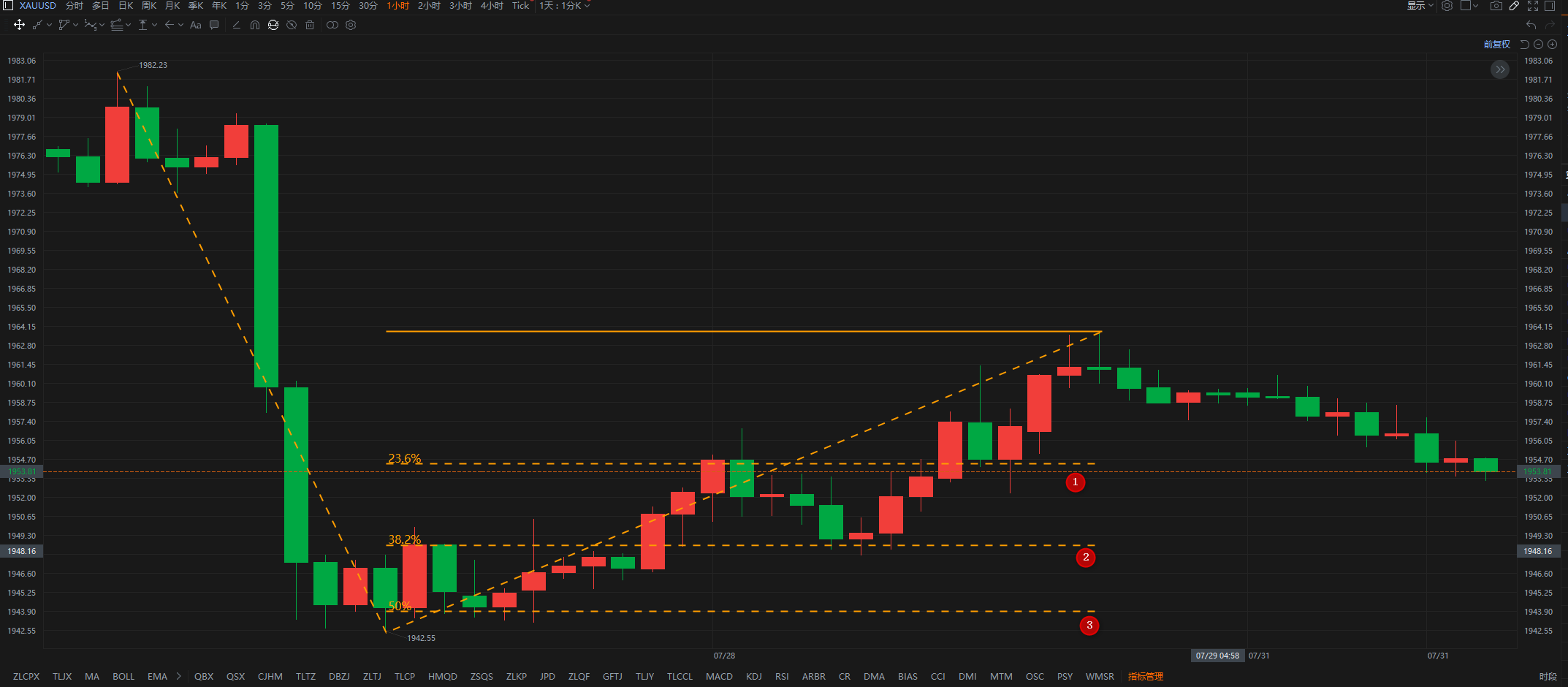 通过对黄金小时图解析得知,昨日行情先跌后涨接近下方2号支撑位止跌反弹晚间到达上方1972一线冲高回落我们从下方的幅图中可以清楚地发现前期在回落的过程中在阶段性底部区域都出现了多头主力布局建仓的动作星期五晚间也是都出现了不错的反弹空间上周五受数据影响冲高回落,我们上周五就已经说过短期将会继续宽幅震荡运行