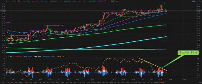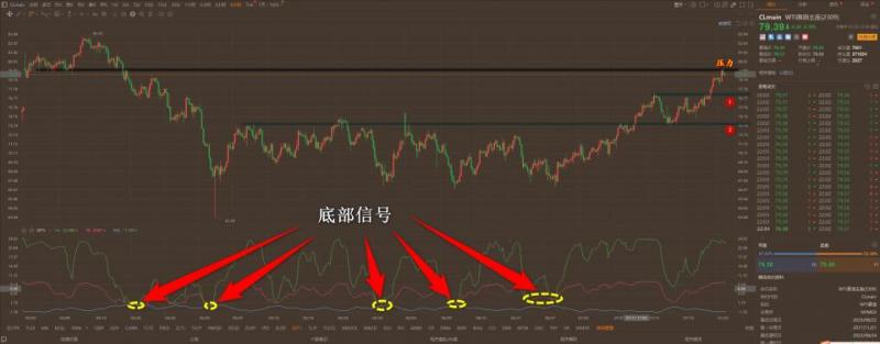 通过对原油4小时图解析得知,昨日行情继续震荡上行晚间一度到达79.90一线的压力位目前有所调整,前两个交易日就已经说过近几个交易日行情在拉升但是多头主力在出货,说明拉升已经接近尾声,冲高回落的可能性比较大,下方我们重点关注下方12号的强支撑即可,行情之所以会出现反弹上涨我们从下方的附图可以清楚的看到在每