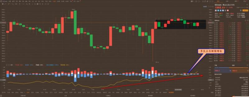 通过对原油小时图解析得知,昨日行情冲高回落,短期在高位形成小幅震荡调整动作,前几个交易日就已经说过短期这种行情的拉升属于多头主力出货的行为动作,之所以这么认为我们通过下方的幅图可以清楚地看到前期在底部区域行情下跌但是多头主力不断的增仓介入从而导致行情一波的拉升,目前在高位我们再次看到多头主力在行