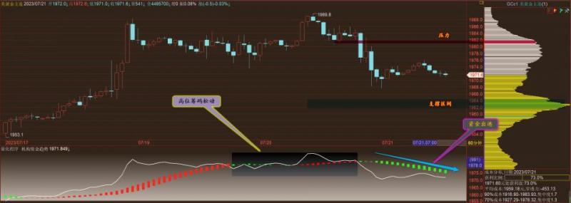 通过对黄金小时图解析得知,昨日行情先涨后跌,在1号的支撑位小幅反弹一波到达上方1968一线冲高回落下半夜跌破下方1956的支撑,目前呈现弱势盘整状态,上方1号支撑位短期已经成为关键压力位,除非今日盘中放量突破并且站上,否则将会继续下探到23号的支撑位,我们从下方的幅图也可以清楚地看到短期已经连续出现底部信号