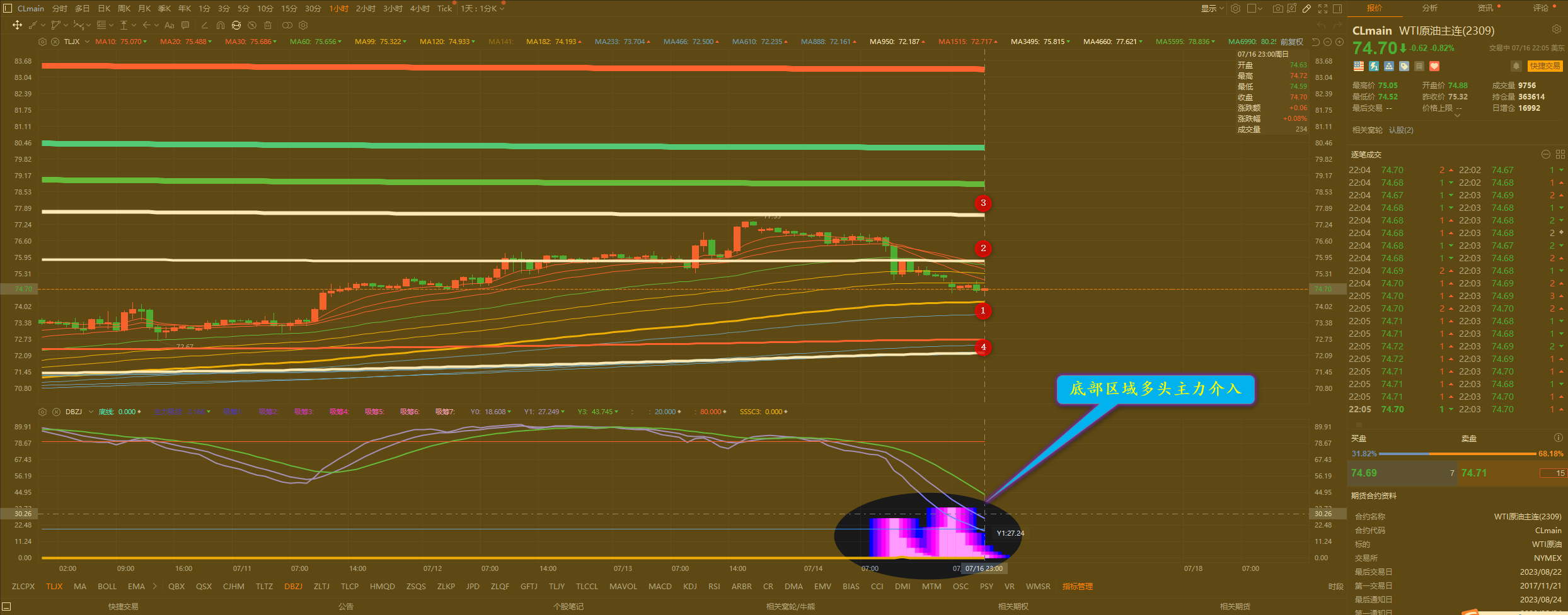 通过对原油小时图解析得知,上一个交易日反弹无力进入短期的调整阶段今日早盘跳空低开非常有可能触及一下下方1号支撑位,我们从下方的附图可以清楚的看到短期已经到达阶段性底部区域有多头主力进仓布局动作但是不排除进一步下探到下方14号均线支撑位,短期上方23号均线依然是重要压力,短期在操作上我们继续高空低多思路