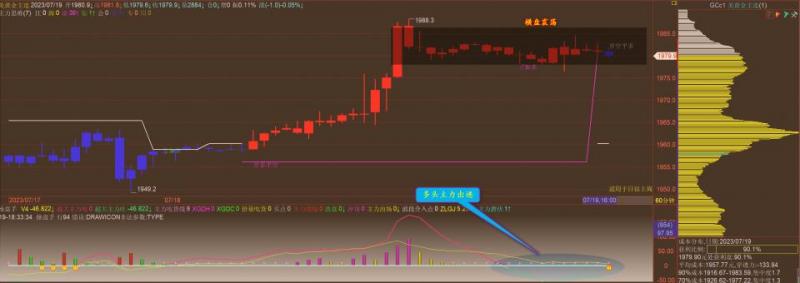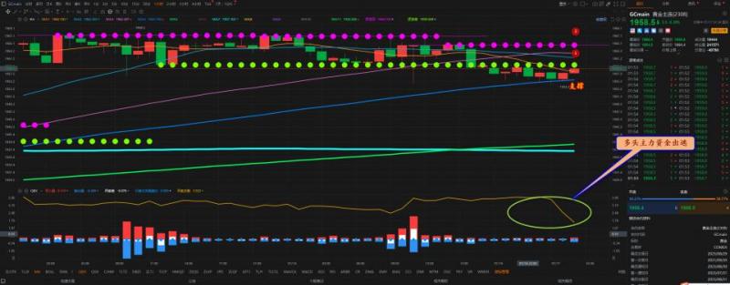 通过对黄金小时图解析得知,黄金从早盘到目前为止一直在1974-1982区间窄幅震荡调整,但是我们从下方的附图可以清楚的发现多头主力从昨天晚上一直在高位处于出逃的状态。多头的力度明显不足就看美盘时间段下方1962-1958的支撑力度,盘中随时关注到下方底部区域的多头主力的动向在参与多头即可,短期操作上我们继续高空低