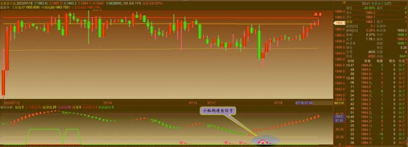 通过对黄金小时图解析得知,黄金从昨天晚上在1956一线止跌反弹,目前在到达是否1962一线的阻力位,相对而言上方均线的压力位也是有一定的阻力,之所以会出现反弹动作,我们从下方的附图可以清楚的看到昨日在下方出现了小机构进仓信号,虽然目前把昨天的下跌收复回来但是上方的压力还没有突破理论上应该是先要调整一下下