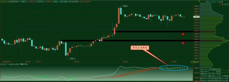 通过对黄金小时图解析得知,昨日行情在高位窄幅震荡调整运行,如期在下方1970一线止跌反弹,在上方1981一线受阻回落,但是我们从下方的幅图可以清楚的看到在高位窄幅震荡期间多头主力有减仓动作说明到达压力位附近多头的动能不足,非常有可能继续回落调整一下,下方我们重点关注12号的支撑即可,短期大方向继续震荡偏上