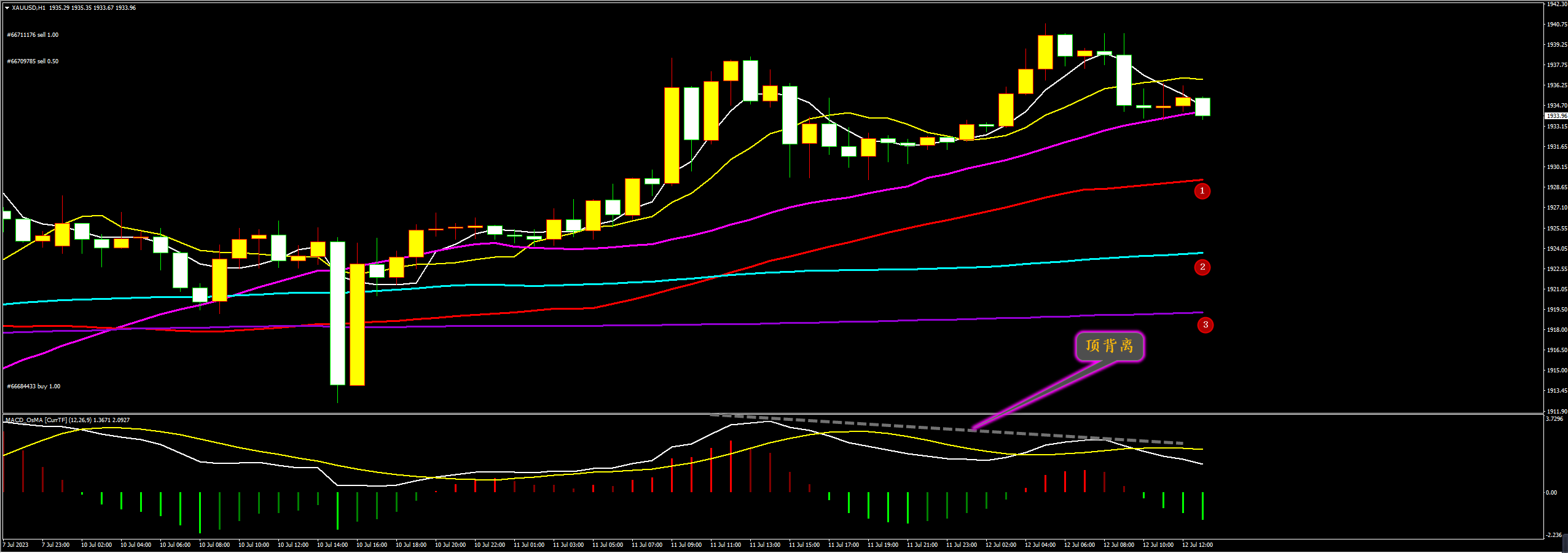 通过对黄金小时图解析得知,上一个交易日行情如期在高位冲高回落,我们从下方的幅图可以清楚地看到上一个交易日行情在高位横盘震荡调整期间多头主力已经出现了拉高出货动作多头的力道明显不足短期下方我们重点关注12号平台的支撑区间,上方我们继续重点关注1968一线的压力,短期继续回落调整的可能性大一点,短期在操作