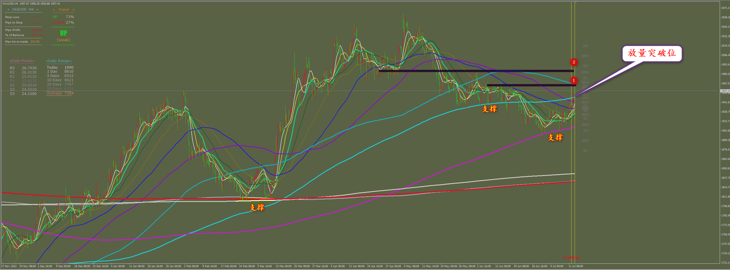 通过对黄金小时图解析得知,昨日行情如期继续震荡上行突破晚间一度到达1960一线附近,纵观全局回头查看一下历史走势黄金在每次深度回调的过程中都到达了下方重要均线的支撑位都出现了反弹近期在下方1900一线的时候也是多次提醒多头主力在下跌的过程中就已经发现了多头主力不断的增仓介入从而导致近期半个月的反弹上涨昨