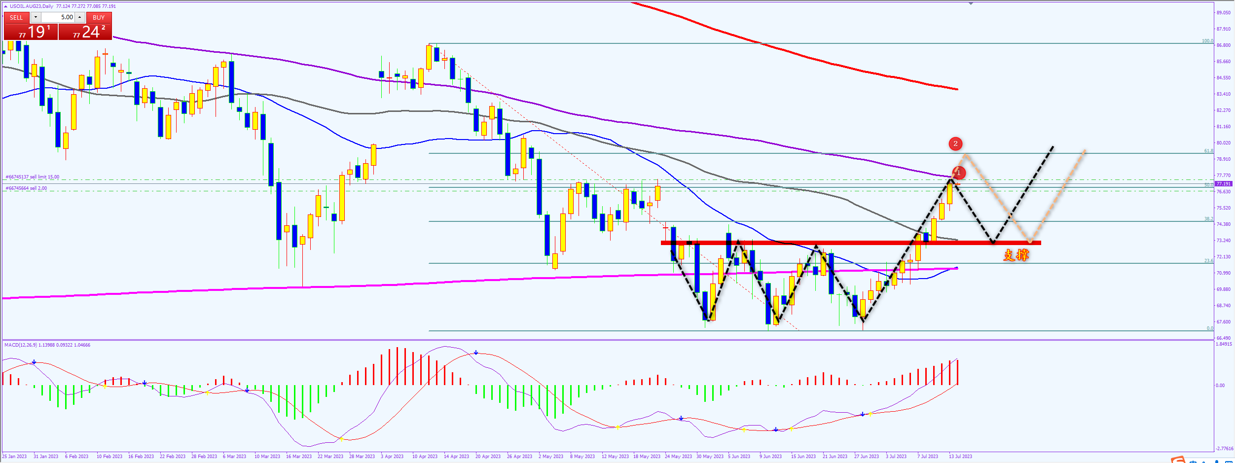 如果对原油日线图解析得知,昨日行情继续延续反弹走势目前已经接近上方1号均线压力位(120日均线),自从原油在底部区域做了一个多重底以来放量突破72.90一线的阻力一路高歌势头比较强劲我们从下方的ACD也可以清楚地看到在底部区域集聚了大量多头主力资金目前已经开始进入强势区运行但是在强阻力位冲高回落调整一下也是