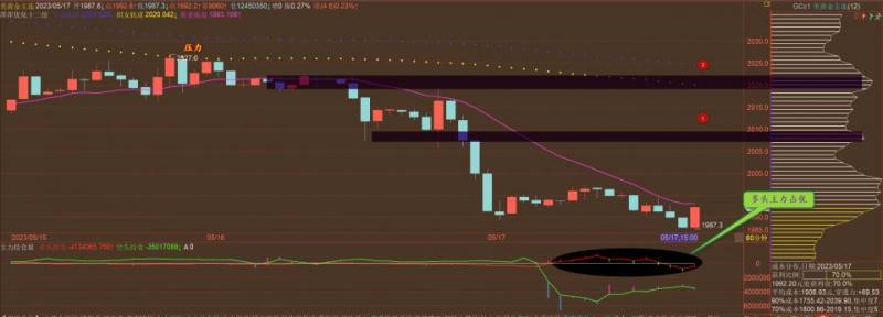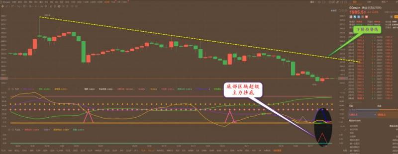 通过对黄金4小时图解析得知,昨日行情延续下跌走势到达下方1974一线止跌反弹动作,之所以会出现止跌反弹动作我们从下方的2个幅图可以清楚地看到大小机构抄底介入并且出现了增仓动作,以及底部区域的绝地反击信号,到目前为止还没有出现大幅拉升,我们继续回归到1970-1980这个区间做多即可,短期上方我们重点关注下降趋势