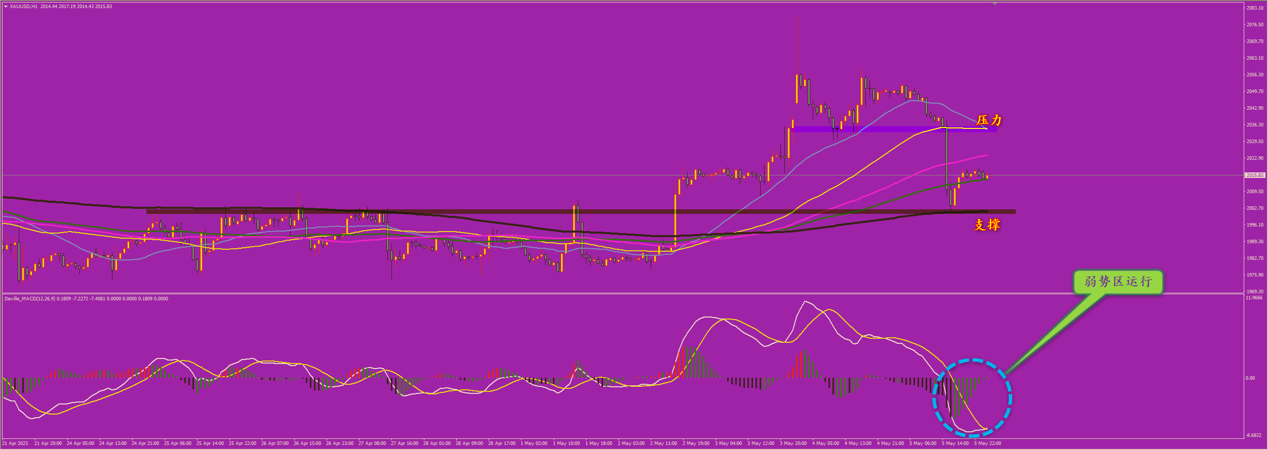 通过对黄金小时图解析得知,我们从主图中可以清楚地看到前期均线系统处于空头排列行情反弹到上方均线压力位多次受阻回落,在5.02日晚间放量突破上方压力位一路狂奔到达上方2080一线冲高回落再次调整回落到下方2号均线的位置得到支撑我们盘中通知再次出现绝地反击信号近几个交易日行情沿着均线系统一路震荡上行短期下方我