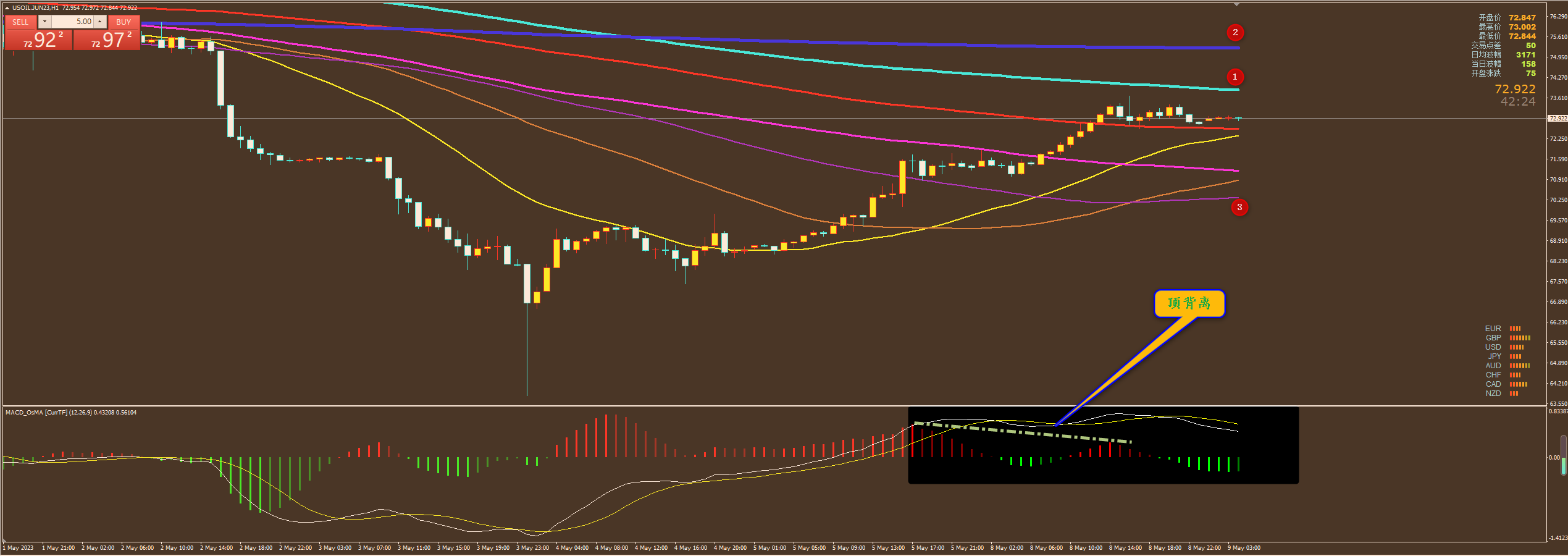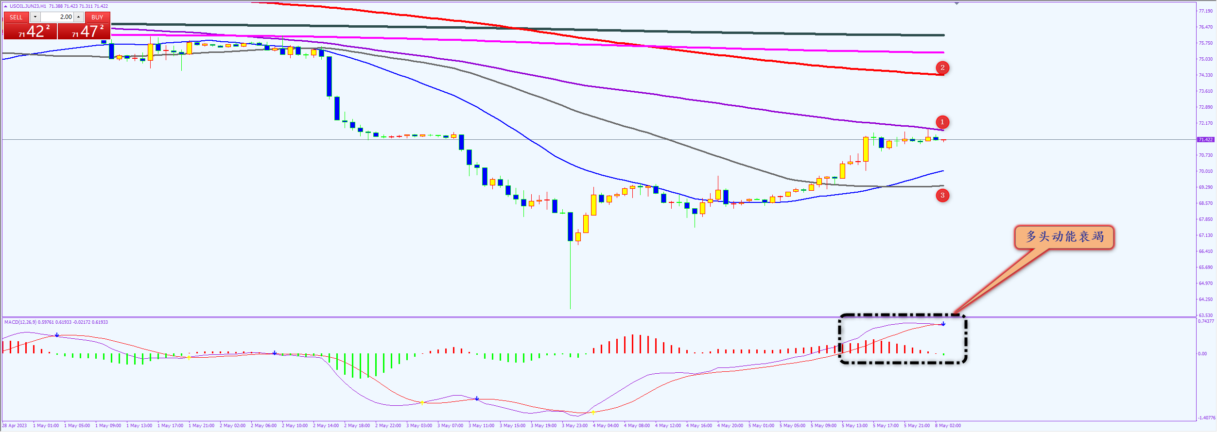 通过对原油小时图解析得知,昨日行情继续延续反弹行情,自从在下方见底反弹以来已有1000点空间目前即将到达上方年线的压力位(1号位),从下方的ACD来看目前上方已经出现了顶背离迹象并且在高位形成了死叉迹象说明在高位即将要进行一波调整动作,短期上方我们继续重点关注12号均线的压力,下方重点关注3号均线的支撑即可