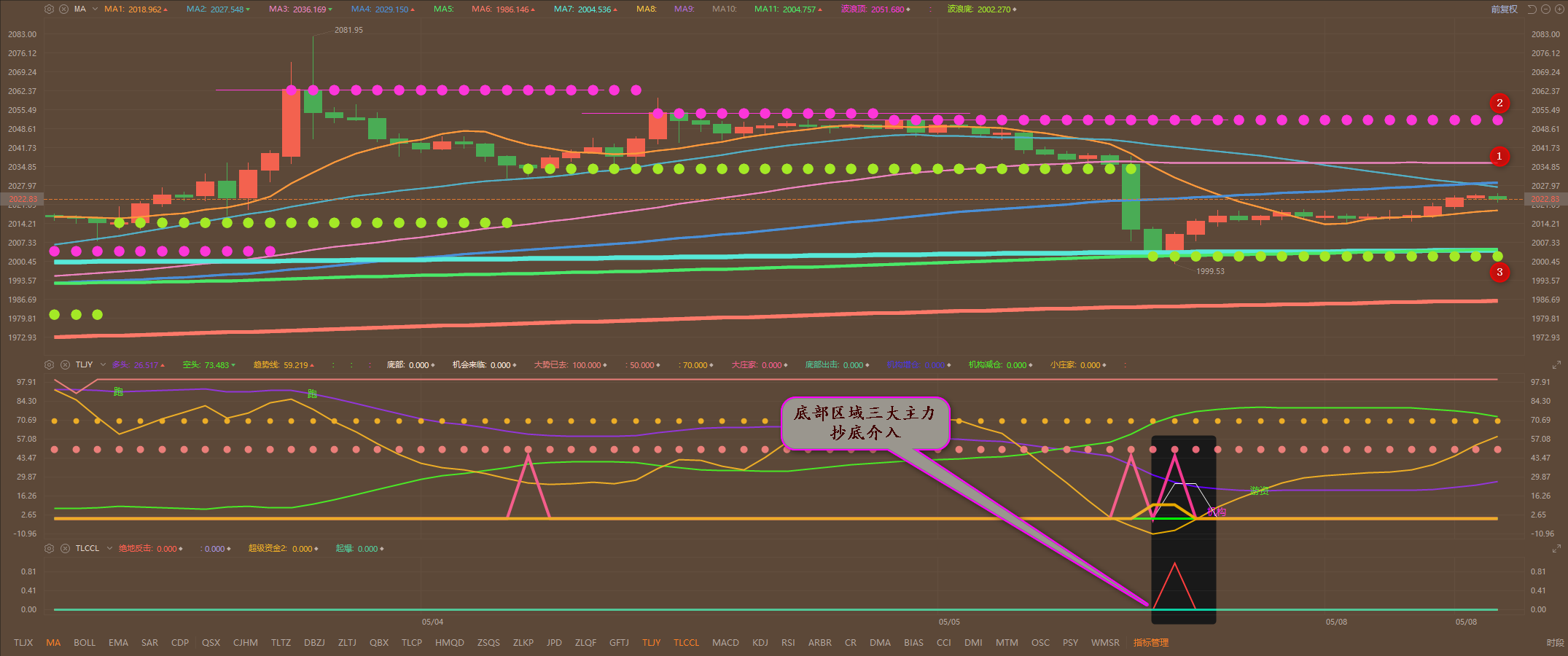 通过对黄金小时图解析得知,自从超级主力在2000附近进仓以来目前依然继续反弹中,除了在下方出现了均线强支撑外在这一线再次出现了绝地反击信号和三大主力抄底信号短期上方12号压力位成为短期,下方3号均线支撑依然是3号位置附近,短期应该是要继续震荡调整一下回调确认一下下方支撑的有效性,短期在操作上我们继续先高